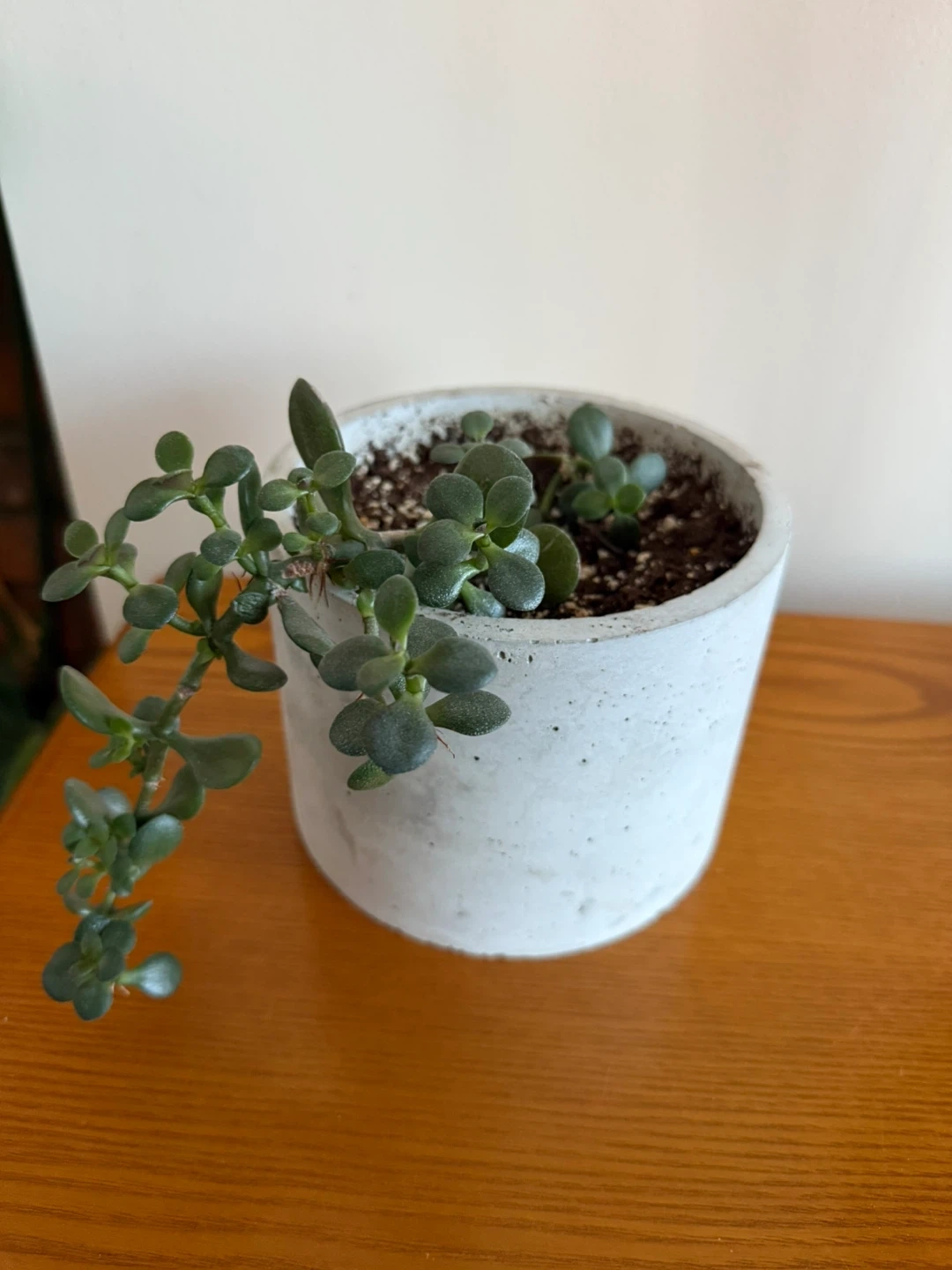 A jade plant is potted in a grey concrete planter. It's a low-maintenance succulent.