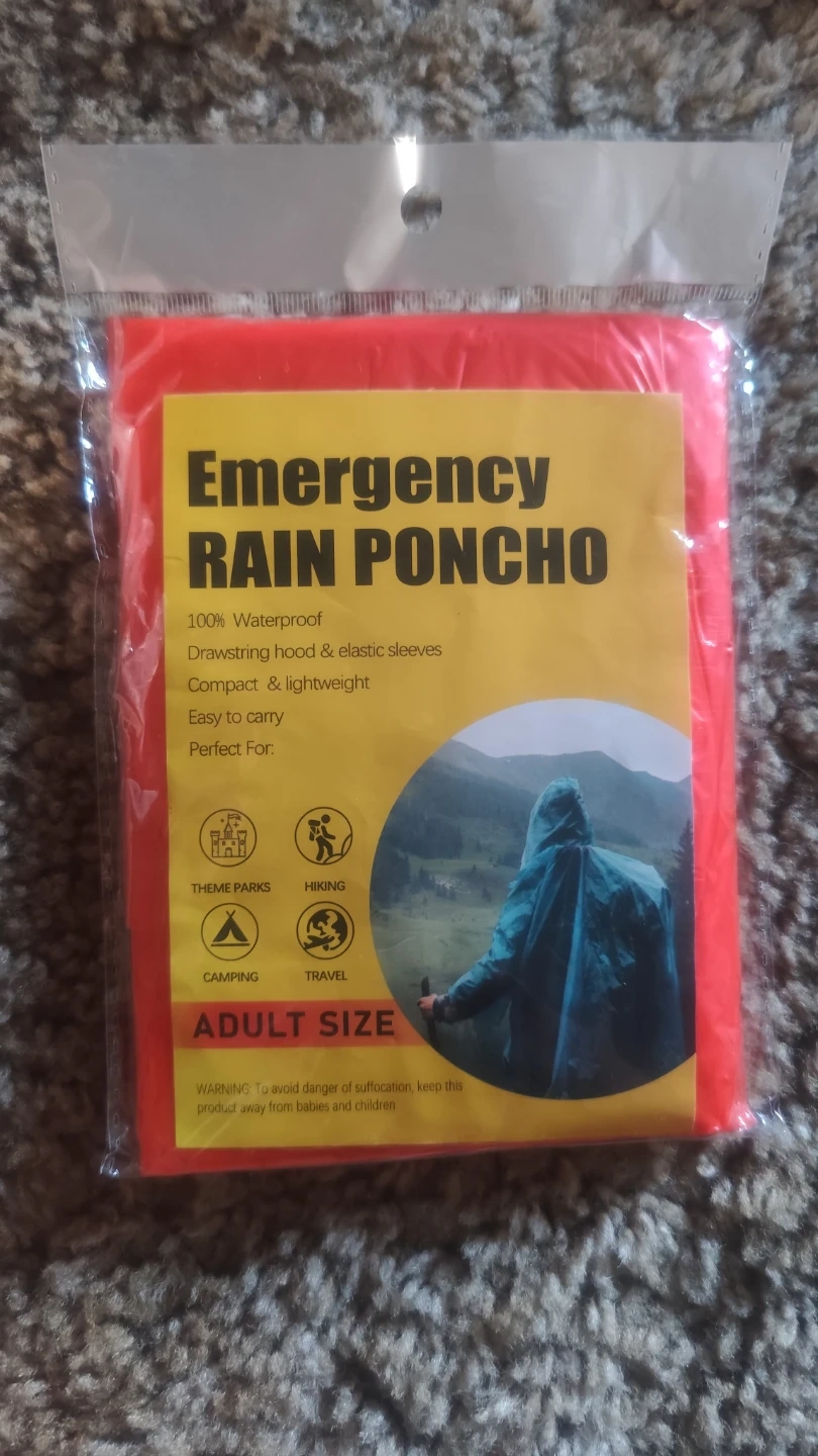 100% waterproof emergency rain ponchos. Drawstring hood and elastic sleeves. Compact and lightweight, easy to carry. Perfect for camping, hiking, theme parks, and travel.