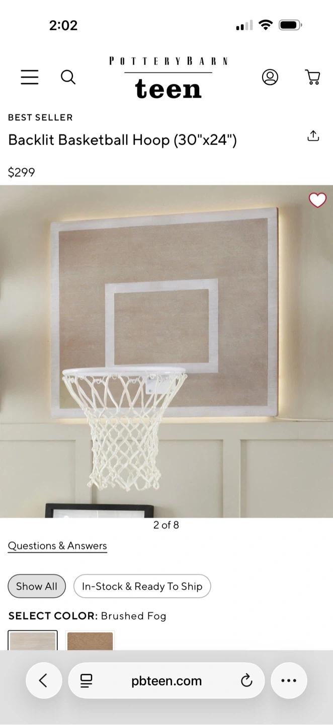 This is a Pottery Barn Teen backlit basketball hoop. It's 30"x24" in size and comes in Brushed Fog color. Includes the hoop and net.