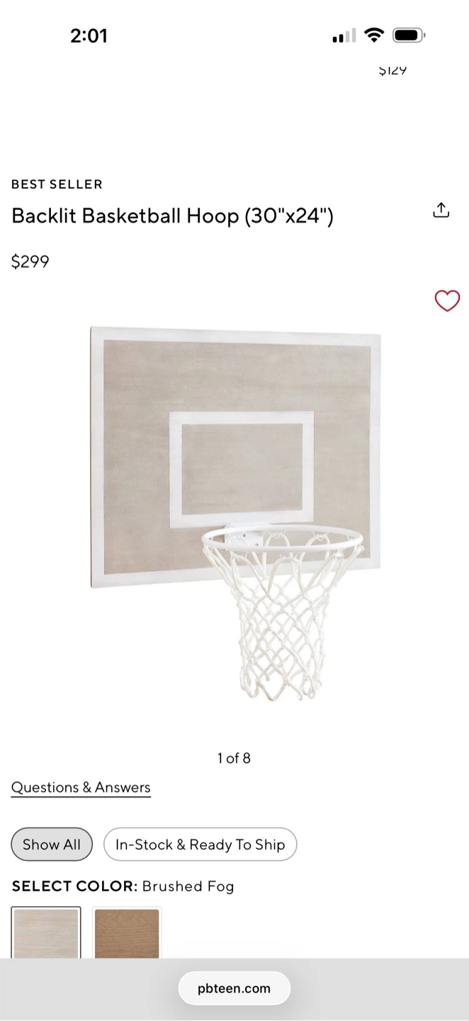 This is a Pottery Barn Teen backlit basketball hoop. It's 30"x24" in size and comes in Brushed Fog color. Includes the hoop and net.