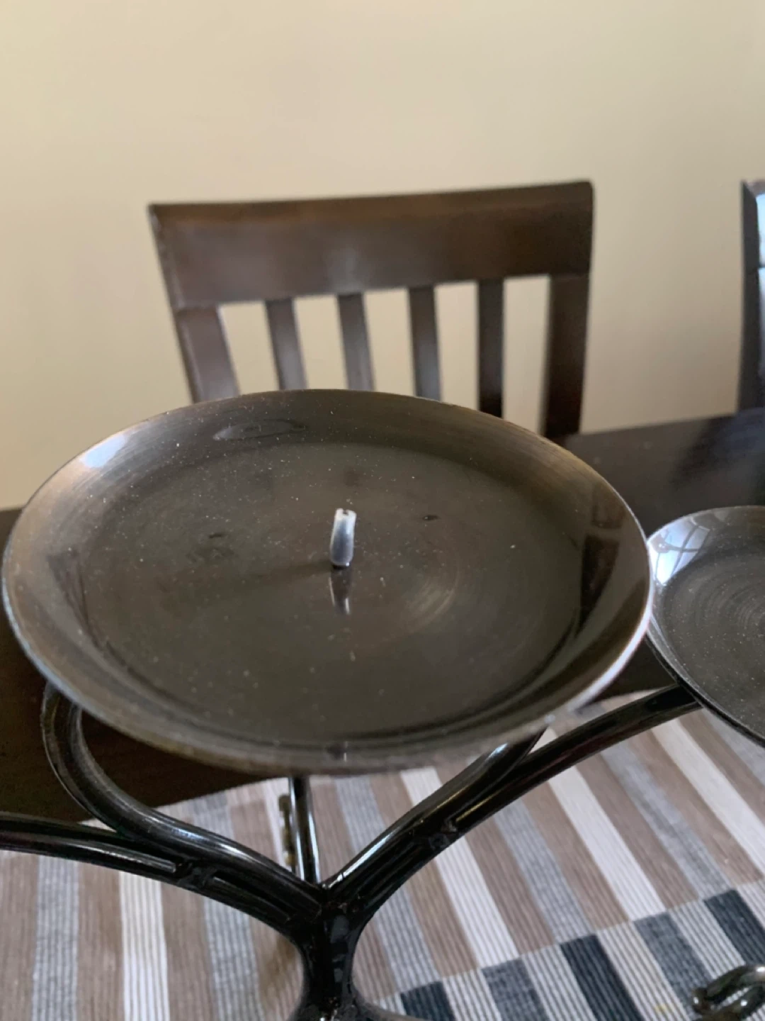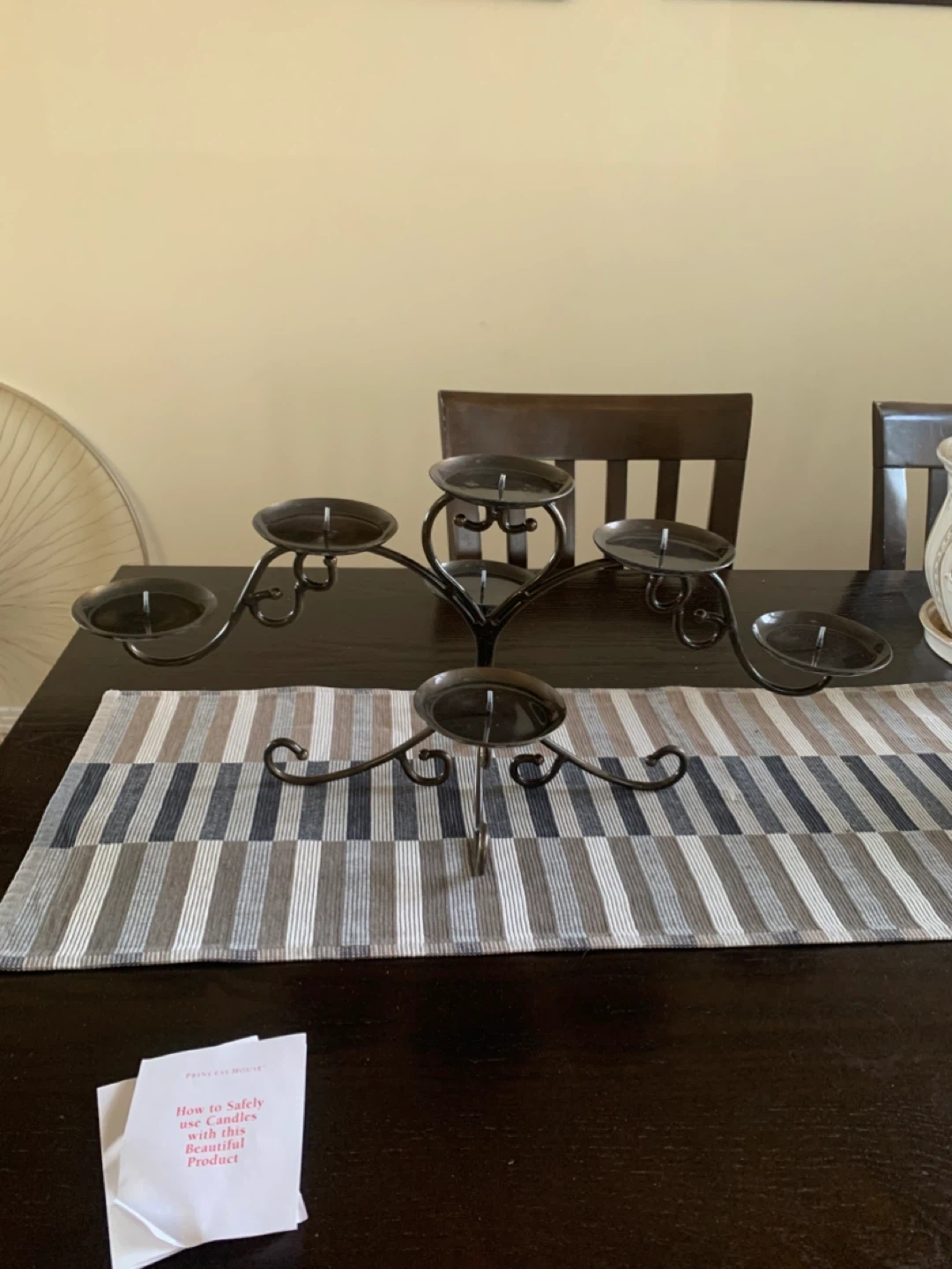 This elegant black metal candelabra holds up to seven pillar or taper candles. It's made of durable metal with a decorative scroll design. Perfect for adding ambiance to your dining table or mantelpiece!