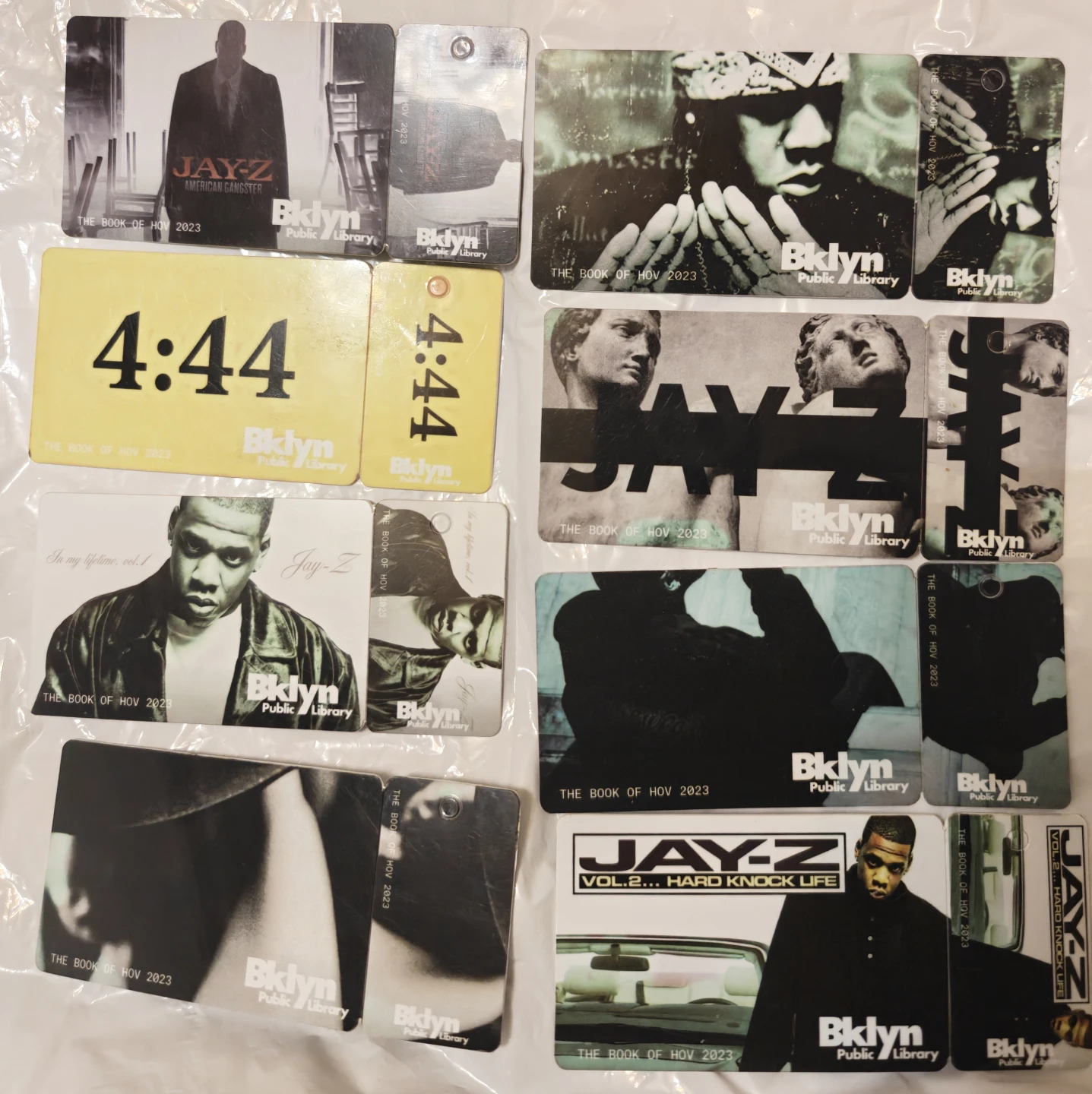 Collection of limited edition cards from the Brooklyn Public Library featuring Jay-Z albums and imagery. Includes designs from 'American Gangster', '4:44', and 'Vol. 2... Hard Knock Life'. A unique item for fans and collectors!