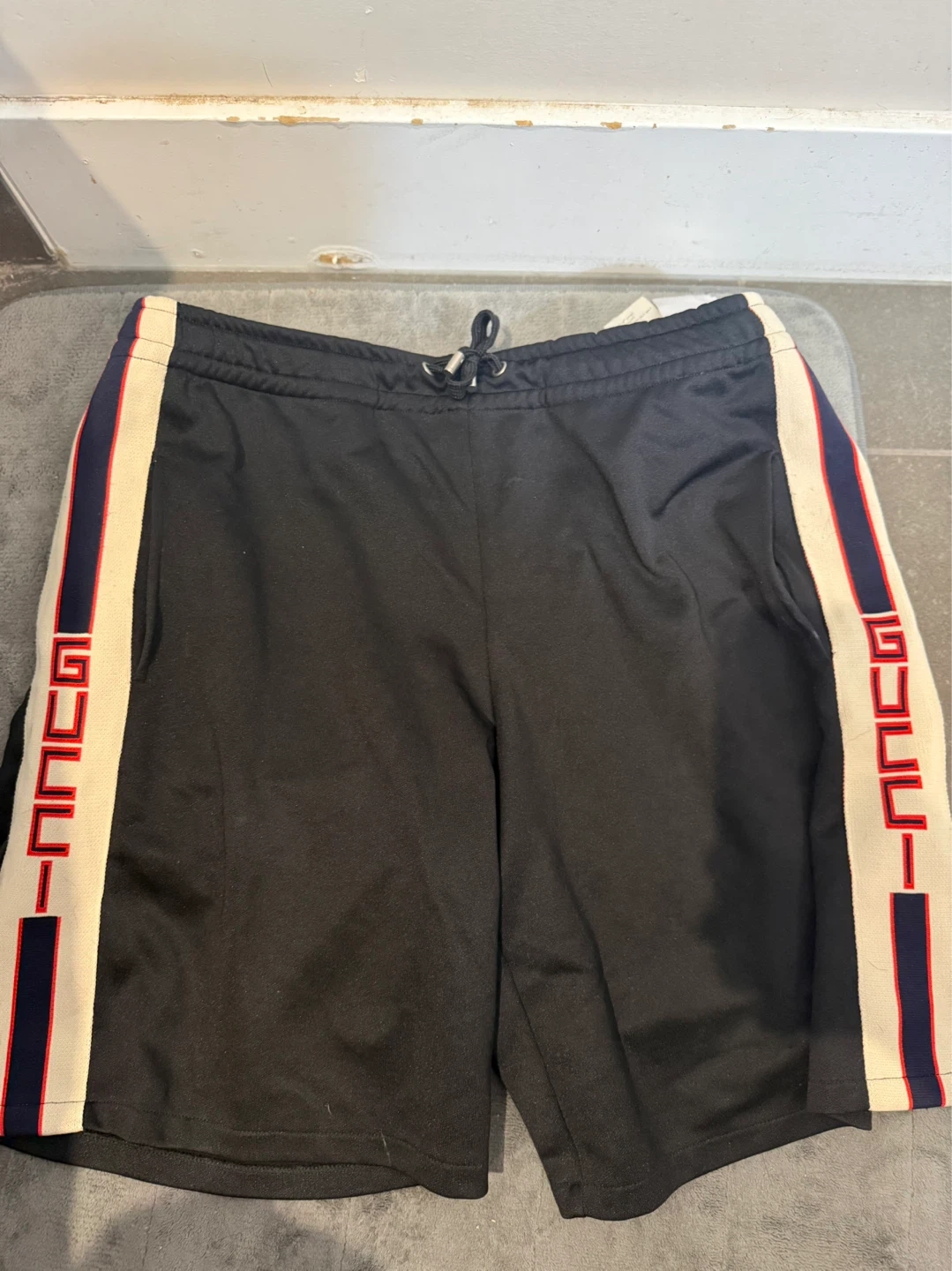 Gucci black track shorts in size medium. They're made in Italy and feature the iconic Gucci side stripe. These shorts are great for casual wear or athletic activities.