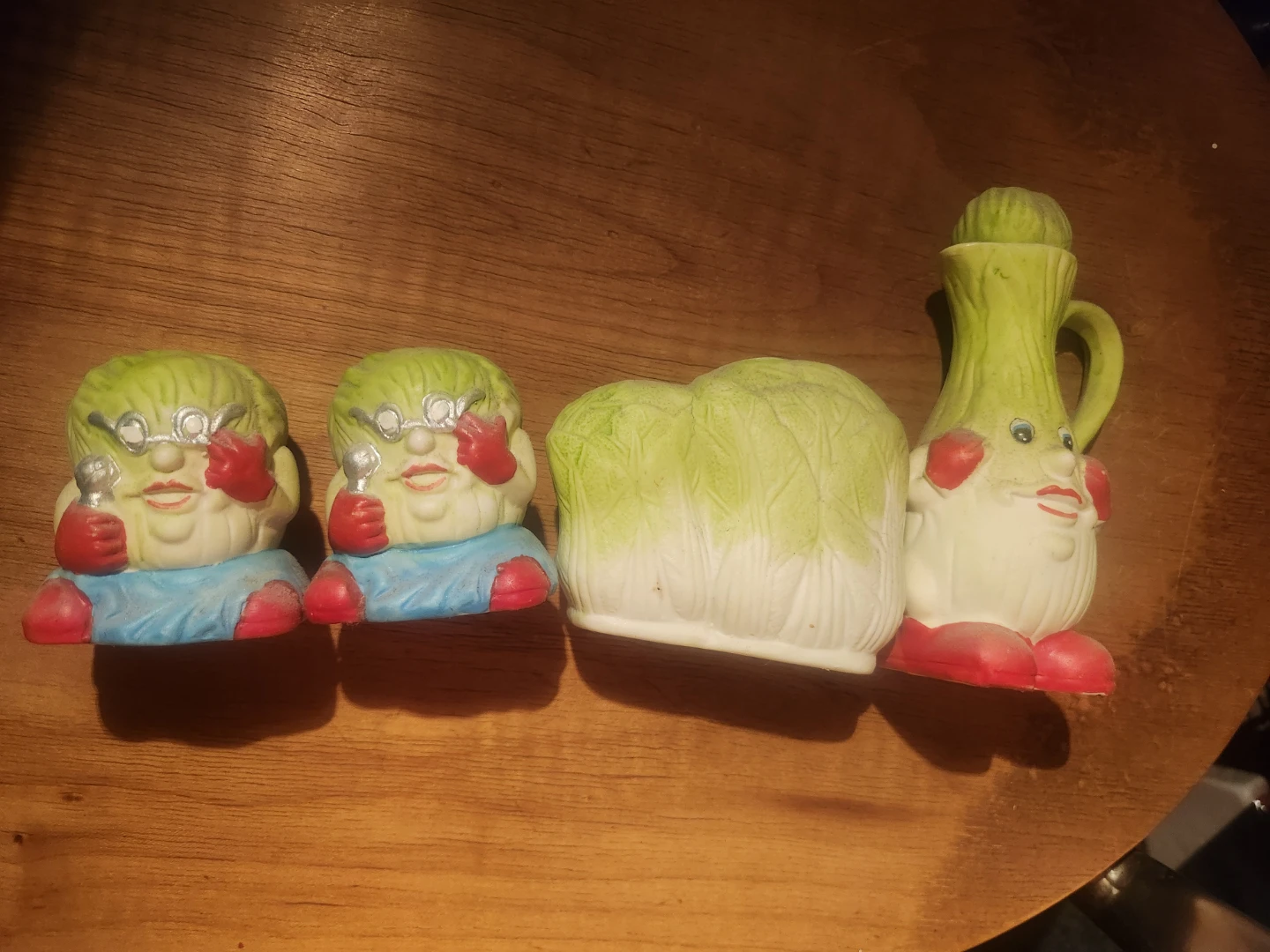 I am selling a set of vintage vegetable people figurines. These quirky pieces include a lettuce head napkin hokder,, two figures with glasses holding what appear to be salt shakers, and a leek-shaped pitcher. They're in good condition and would make a fun addition to any collection!