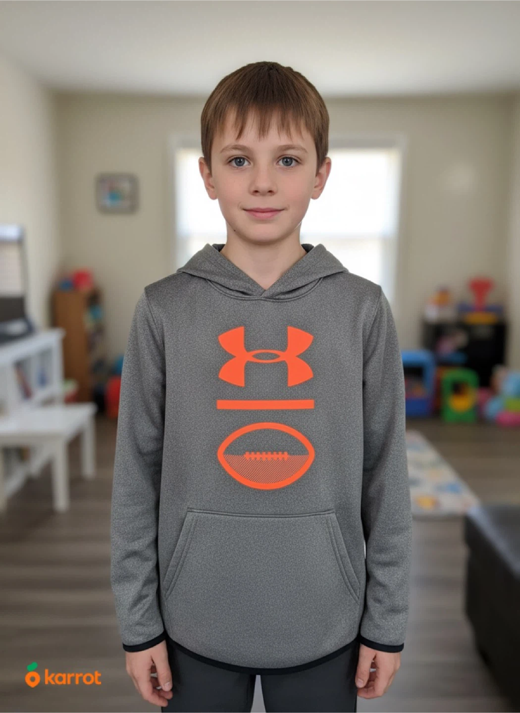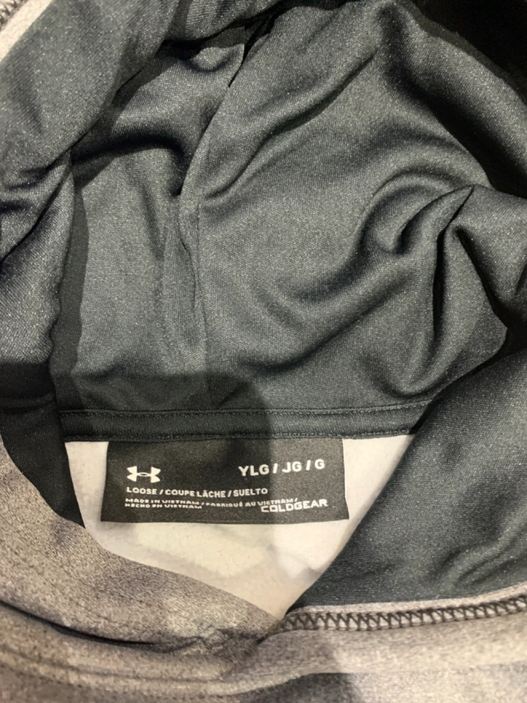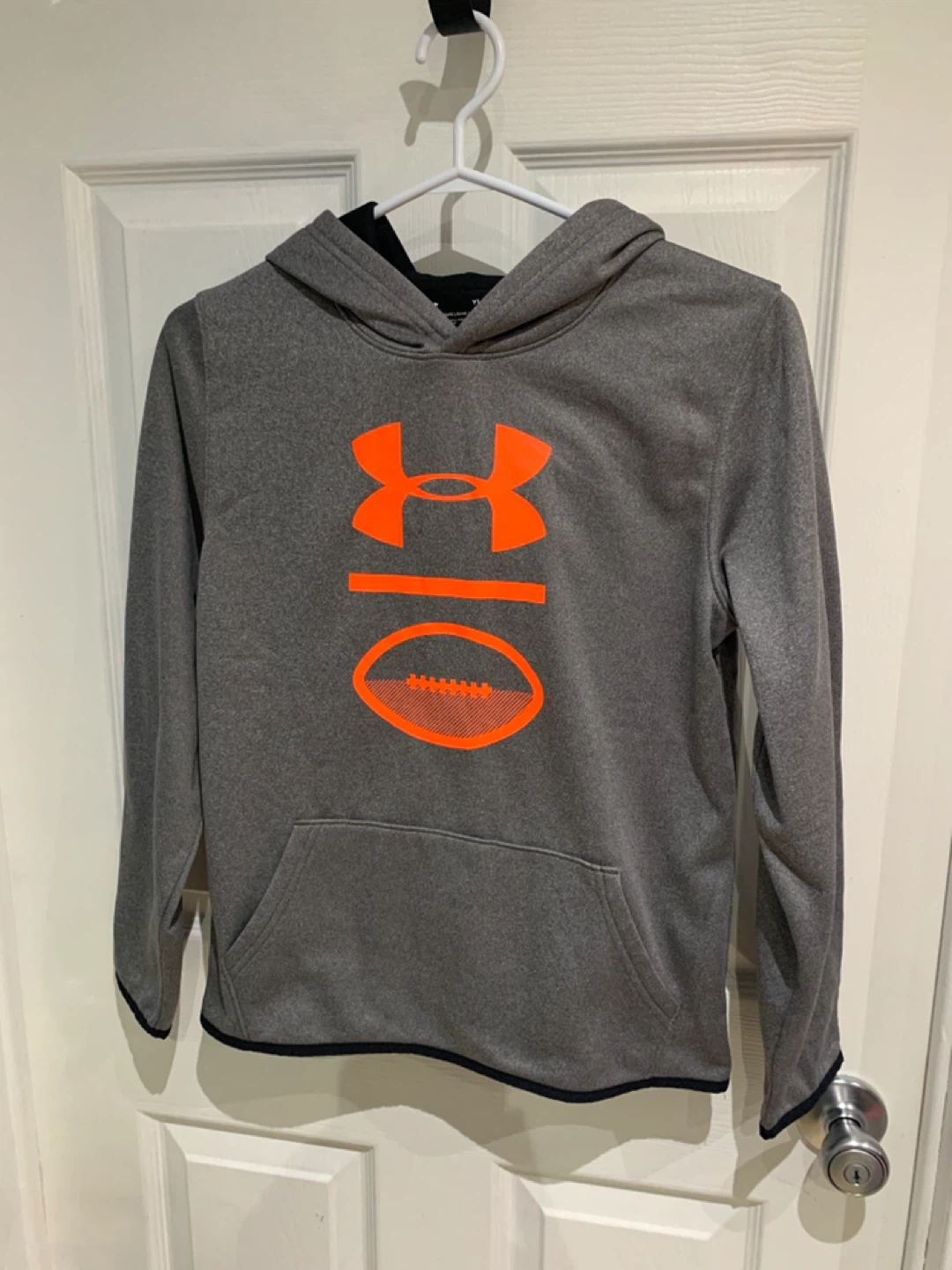 Grey youth hoodie from Under Armour with an orange football logo. It's a size YLG. Made with ColdGear fabric for warmth.