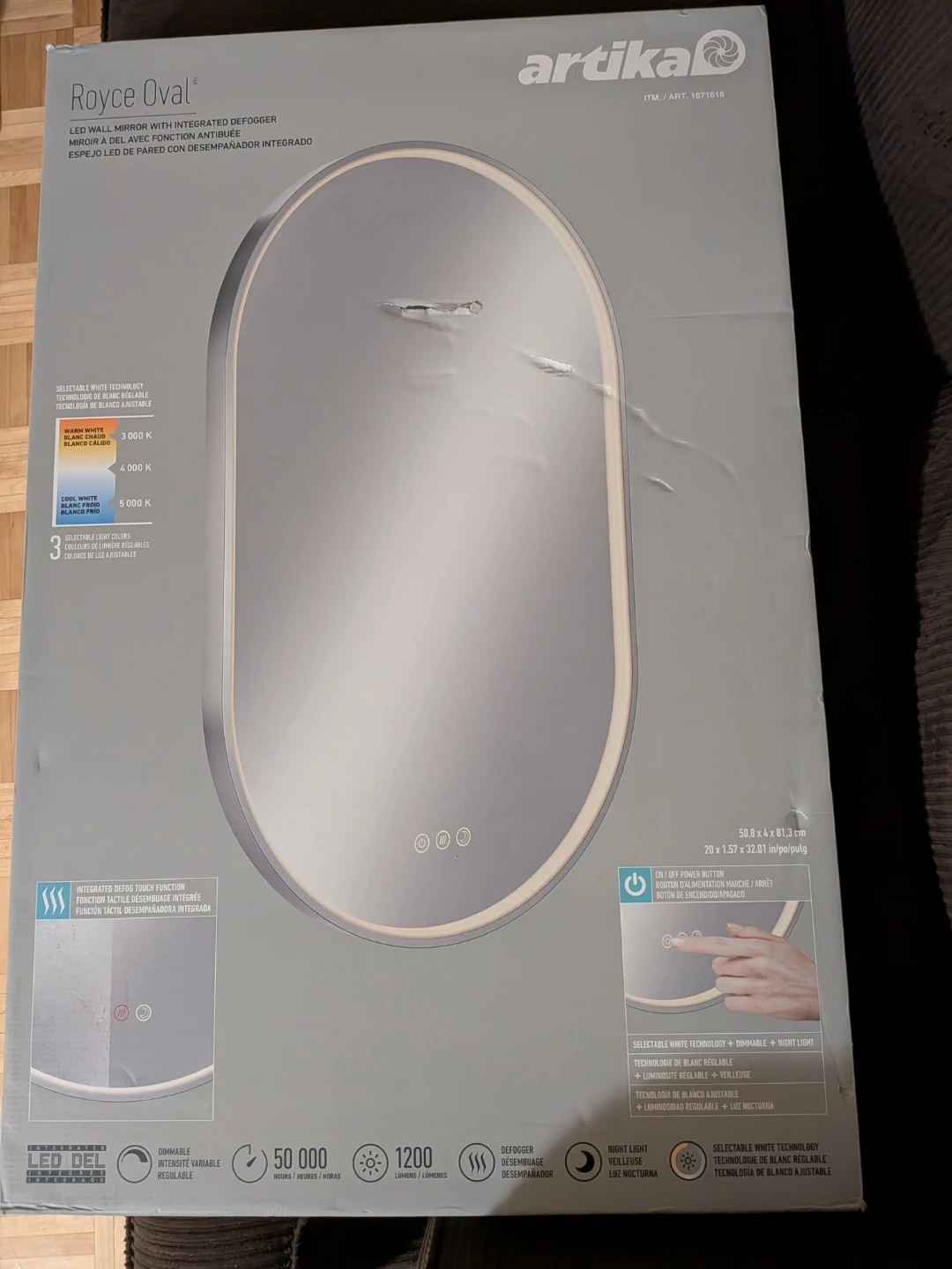 This Artika Royce Oval LED wall mirror features integrated defogger technology. It has selectable white technology with dimmable lighting and a night light function. The mirror has a built-in touch function for the defogger and power.