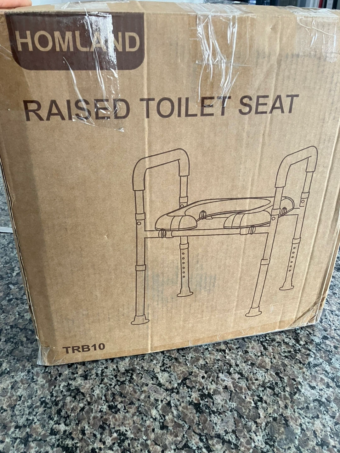 This is a Homland raised toilet seat. It's designed to add height to your toilet for easier use. The adjustable legs ensure it fits securely. It comes with grab bars for added stability.