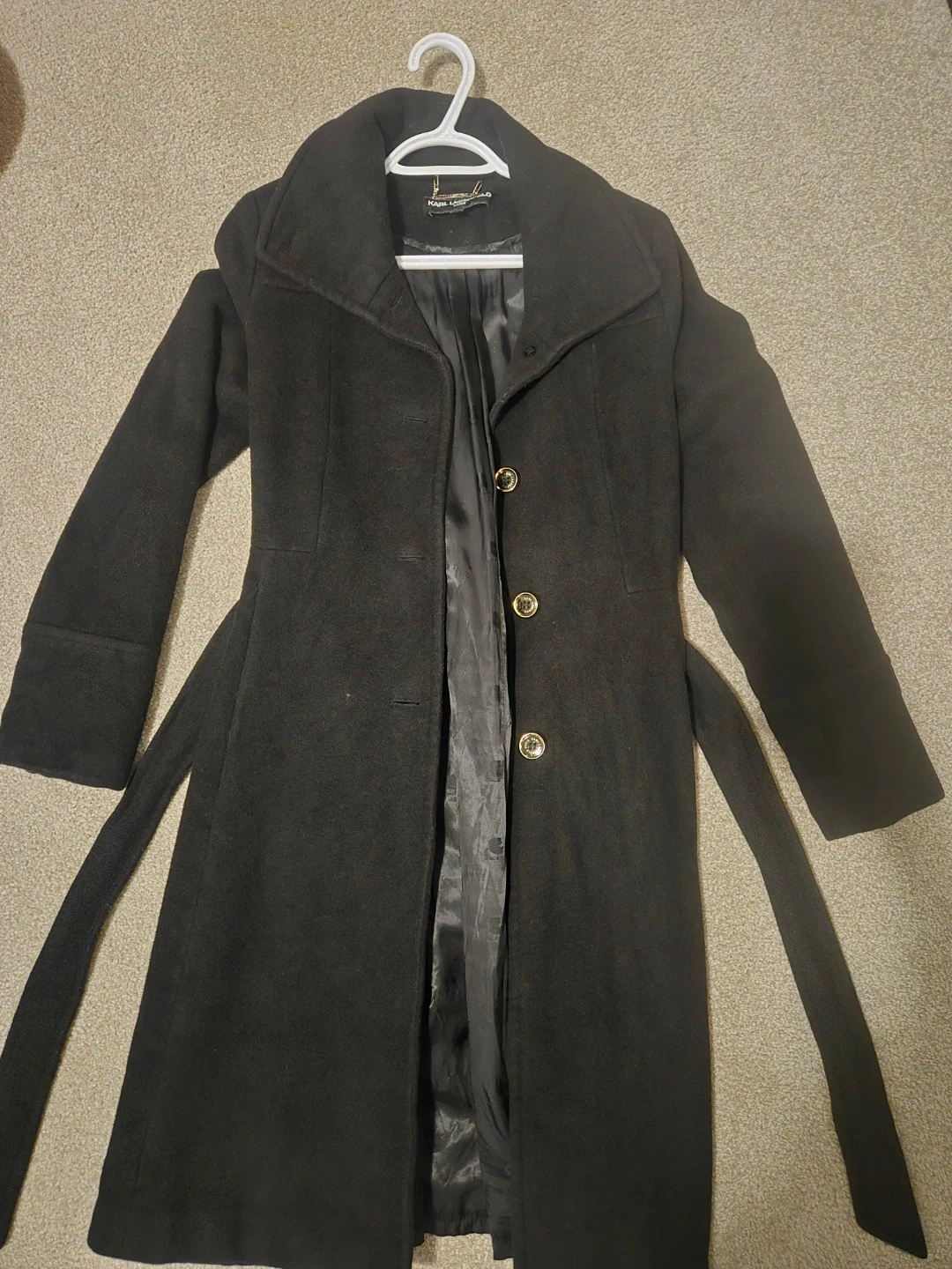 Here's a stylish Karl Lagerfeld coat in a classic black colour. It features a belted and button design, perfect for staying warm and chic!