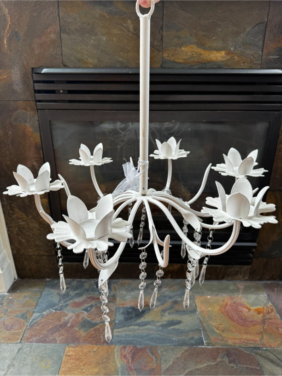 This white chandelier features decorative flower accents and dangling crystals. It has a metal construction and a central support pole with an attachment ring. Use as is, add candles or small plants to each flower holder.