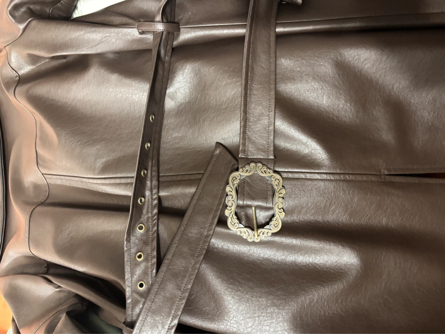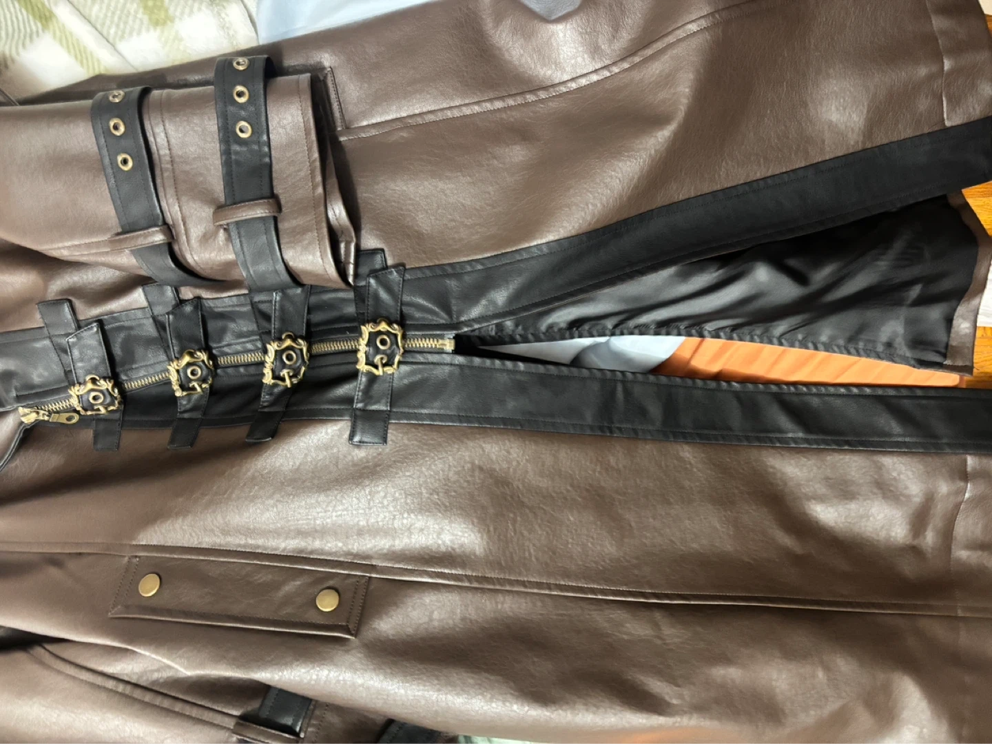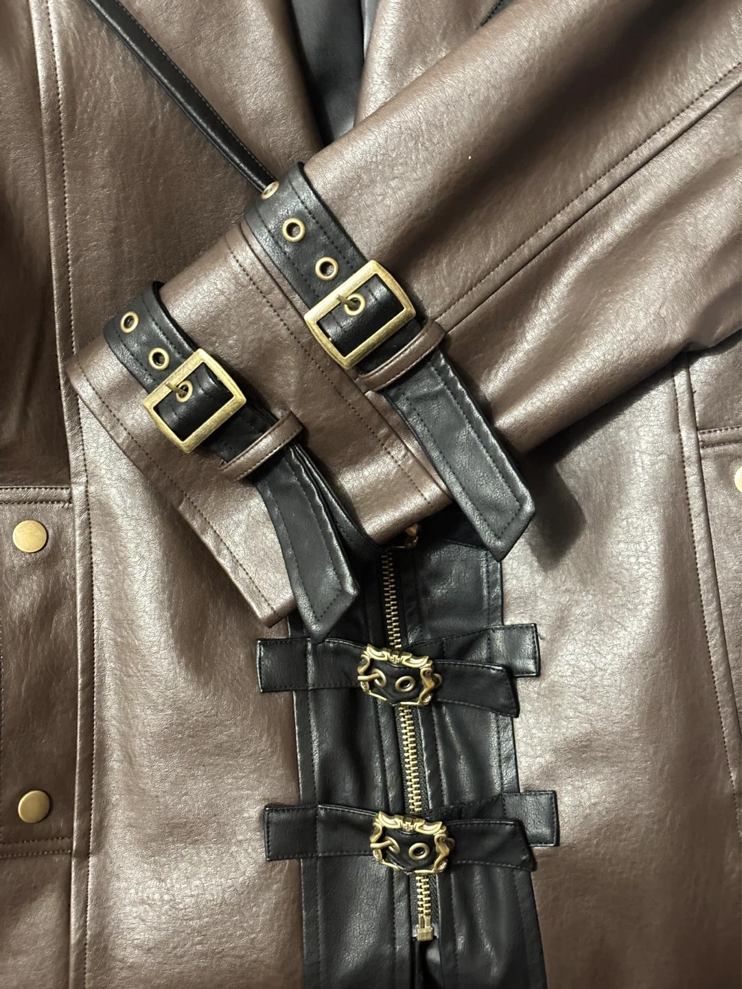 Brown and black faux leather trench coat with decorative buckles and ornate metal zipper accents. It has a satin-like black lining and a belted waist. Includes decorative cross details on the lapels. Perfect for matching lolita dress or Pirate style clothes. Brand new.