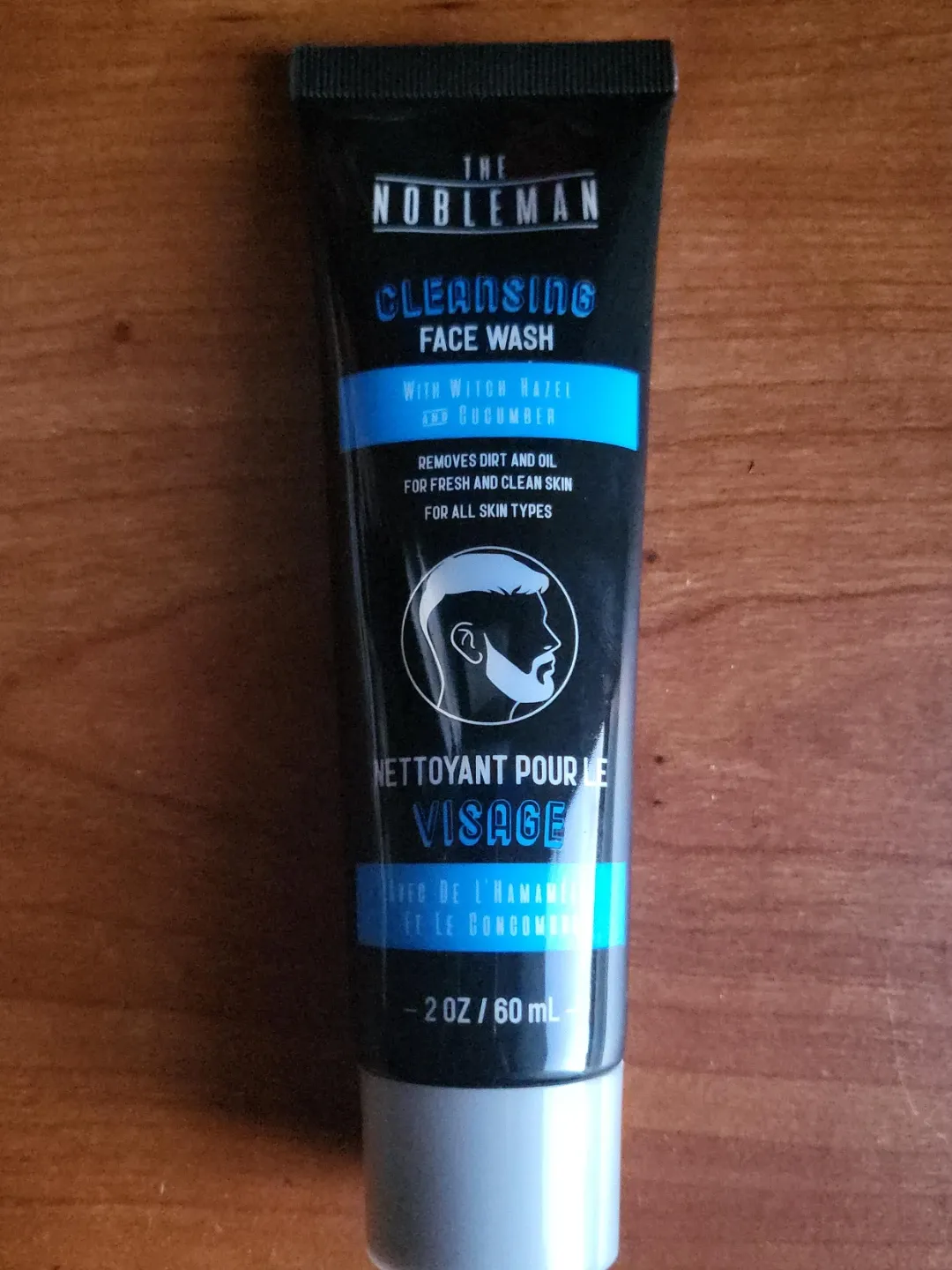 This is The Nobleman cleansing face wash with witch hazel and cucumber. It removes dirt and oil for fresh and clean skin. It's suitable for all skin types and comes in a 60 mL size.