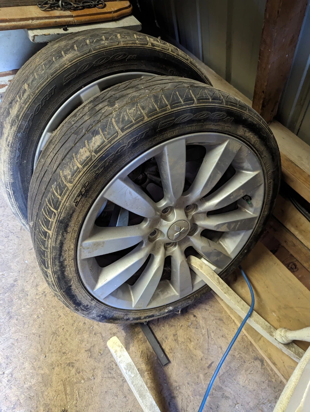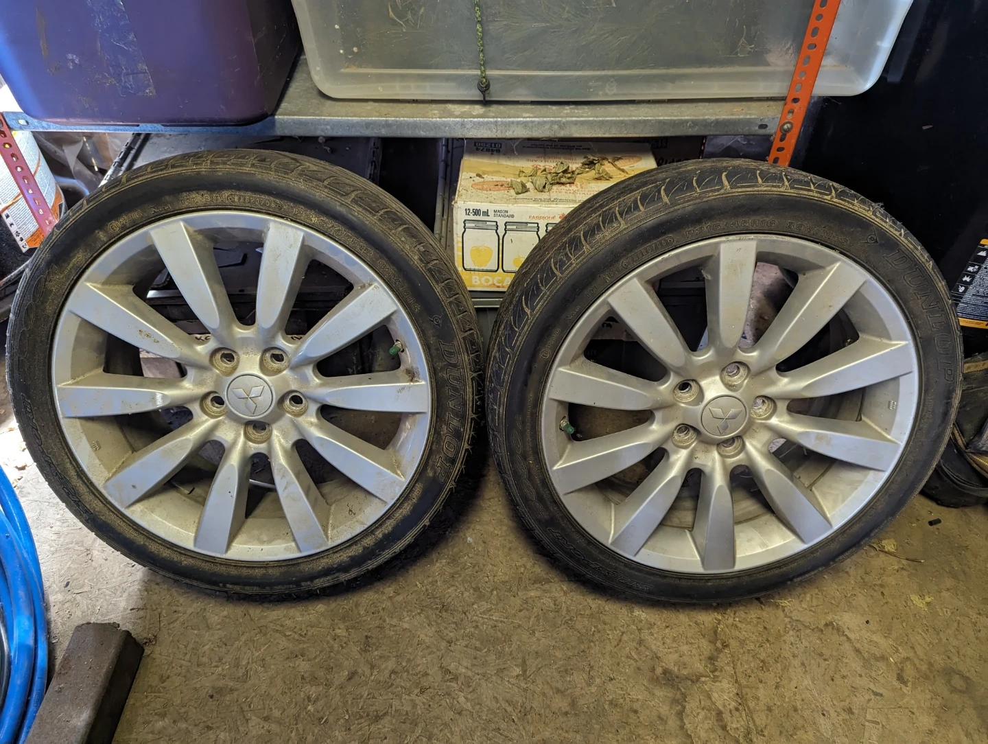 Selling a set of four tires and rims. Tire size is P215/45R18 with an 89V speed rating. Rims have a 5-spoke design and feature a central Mitsubishi logo. These are suitable for vehicles requiring this specific tire and rim specification.