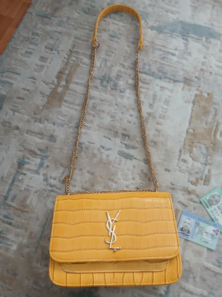 This is a stylish yellow shoulder bag with a crocodile-style texture. It has a gold-tone chain strap and a magnetic closure. The interior is red. It's a great accessory to add a pop of colour to any outfit