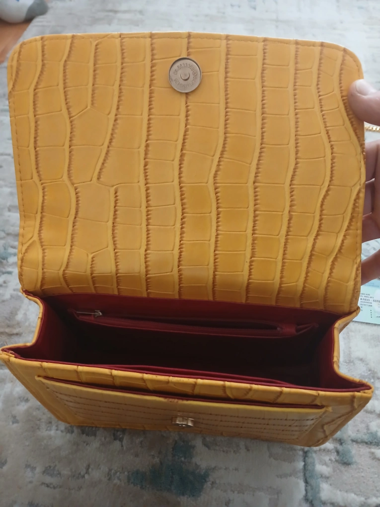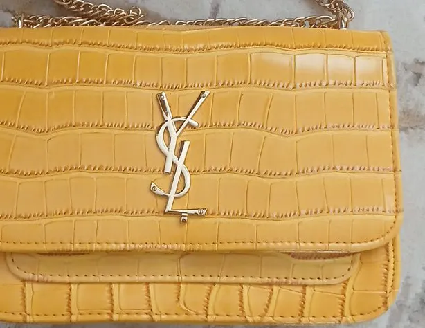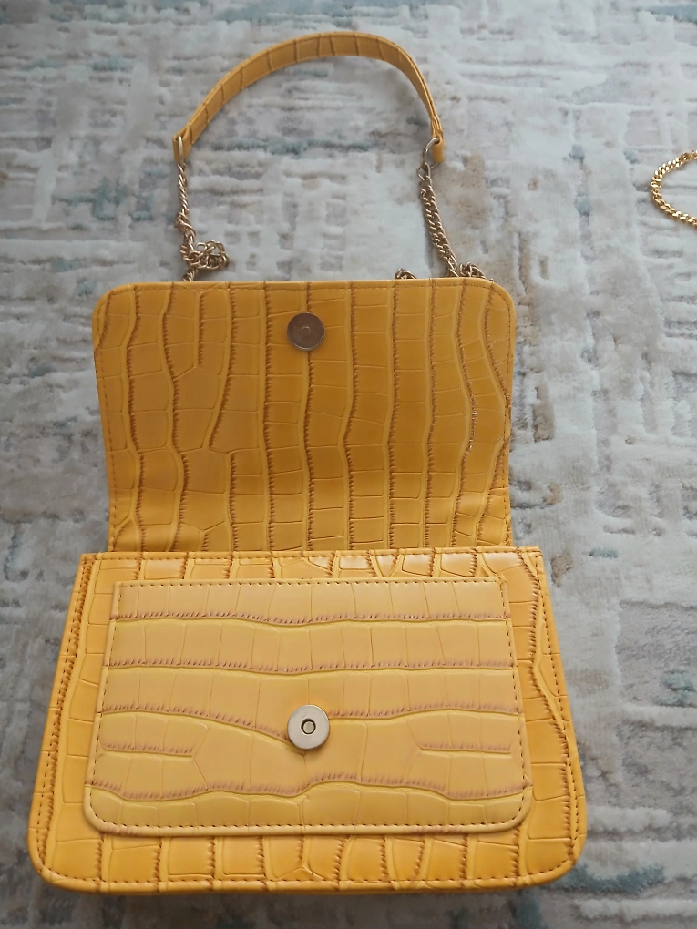 This is a stylish yellow shoulder bag with a crocodile-style texture. It has a gold-tone chain strap and a magnetic closure. The interior is red. It's a great accessory to add a pop of colour to any outfit