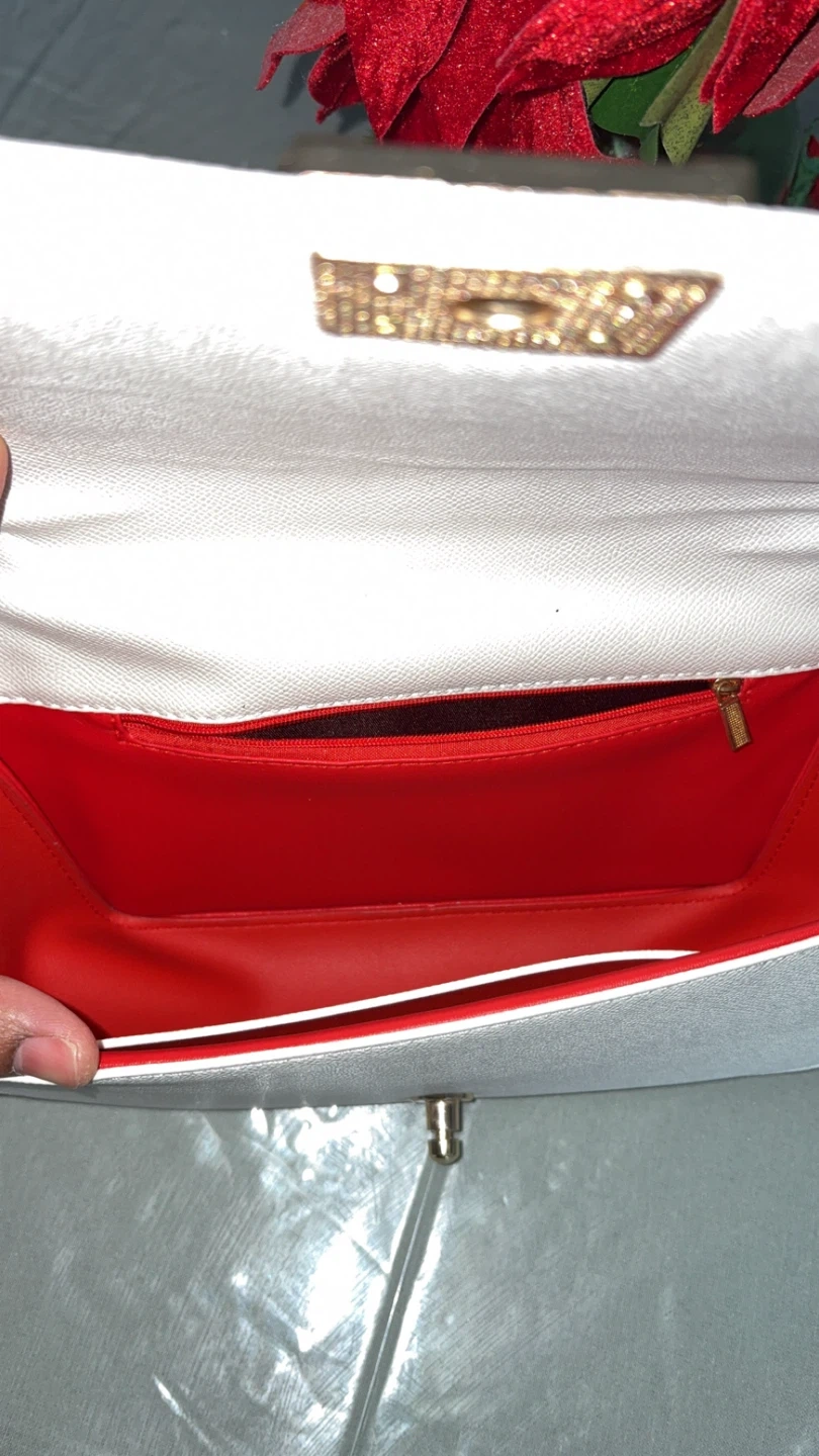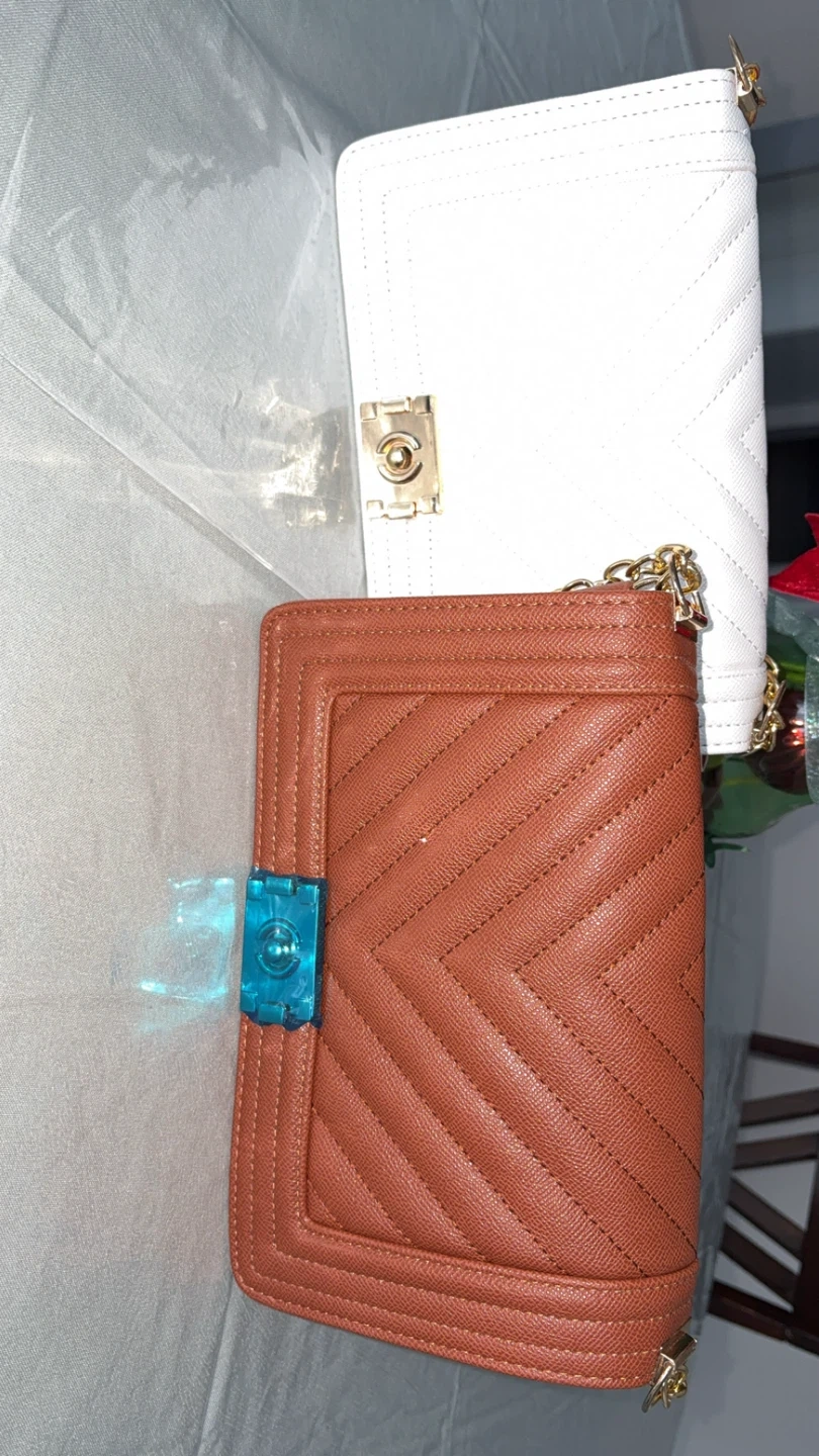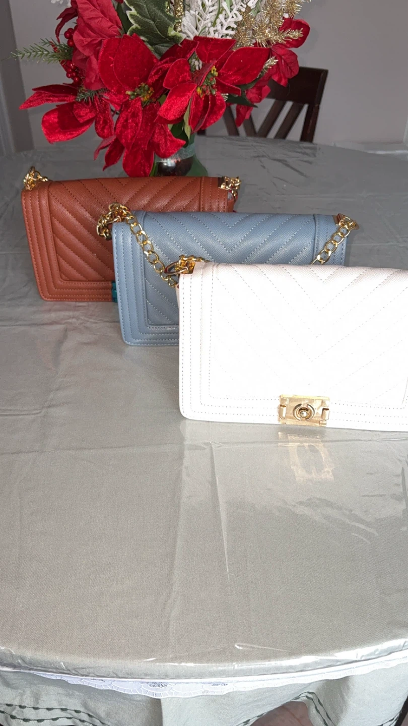 Stylish chevron pattern shoulder bags with chain straps! Available in white, blue, and brown. The interior is lined with a vibrant red fabric, adding a pop of colour to the design