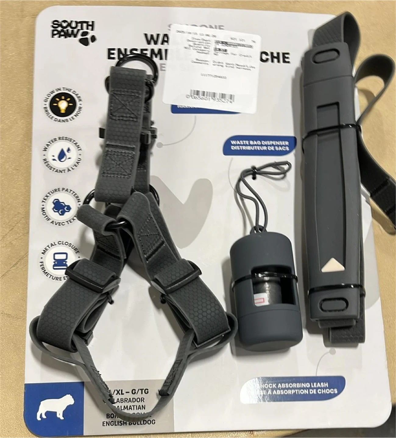 This South Paw Silicone Walking Set is size XL/G-TG. It features water-resistant material and a metal closure. It also glows in the dark and has a textured pattern. Includes a waste bag dispenser and shock-absorbing leash