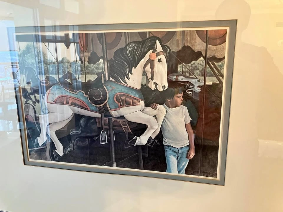 Beautiful framed art print featuring a boy and a carousel horse, with a cool vintage carnival vibe. It has a sleek metallic frame and measures about 41 inches wide by 32 inches high. From New Street Gallery in Burlington, Ontario.