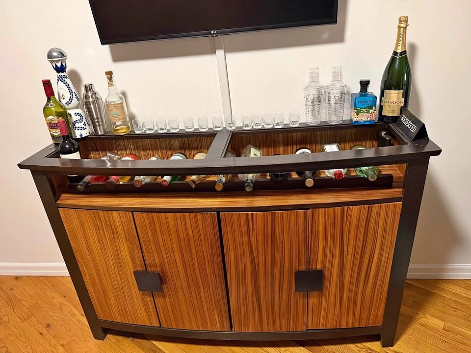 Bar cabinet for sale. Originally designed with a glass top, but the glass piece is not included. Cabinet is still fully functional and looks great. Plenty of storage for bottles, glassware, and bar accessories. Dimensions: 57” L x 15” W x 39” H.