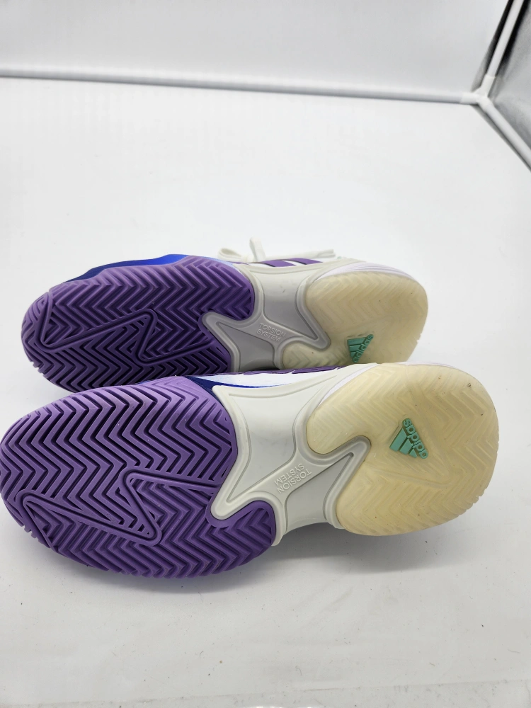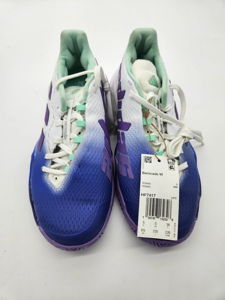 Women's Adidas Barricade tennis shoes. Size 6.5 US. Purple, white, and blue colour scheme. New with tags. No box.