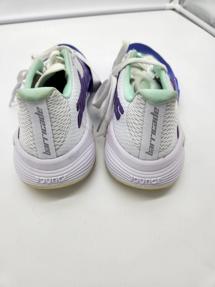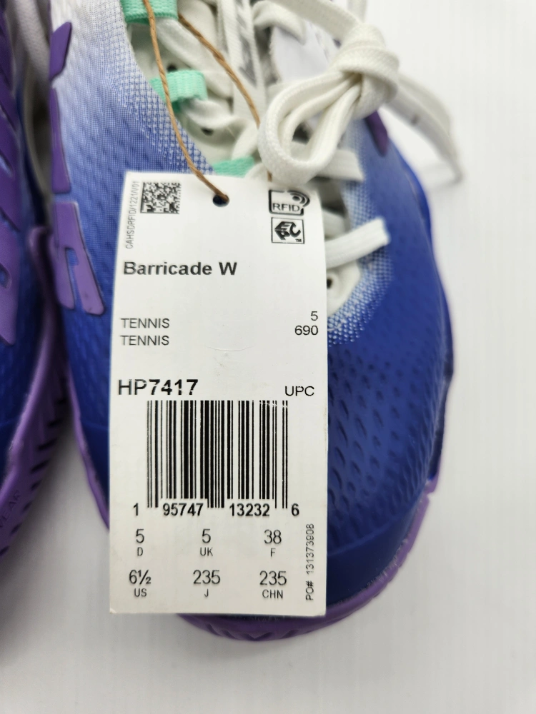 Women's Adidas Barricade tennis shoes. Size 6.5 US. Purple, white, and blue colour scheme. New with tags. No box.