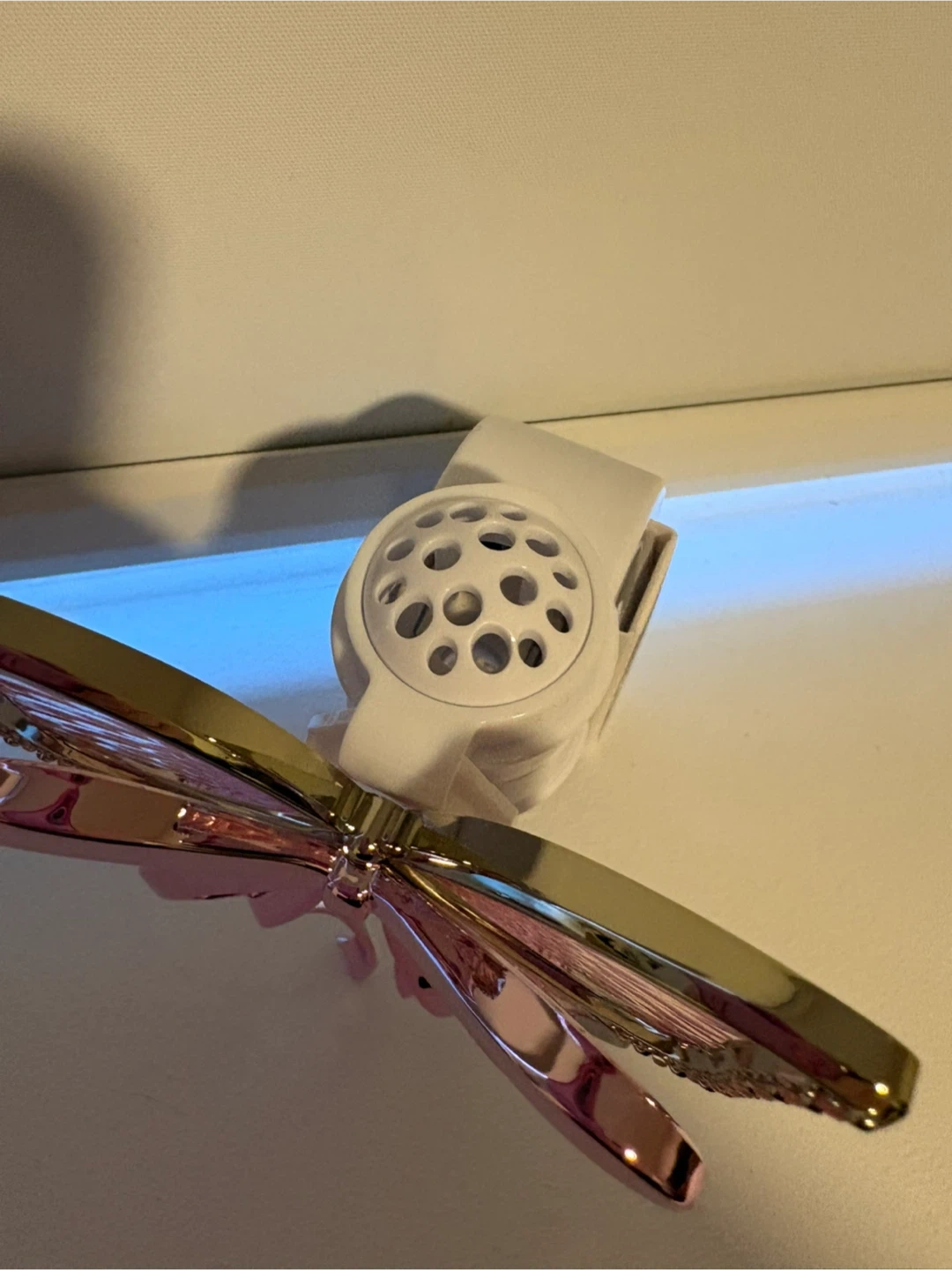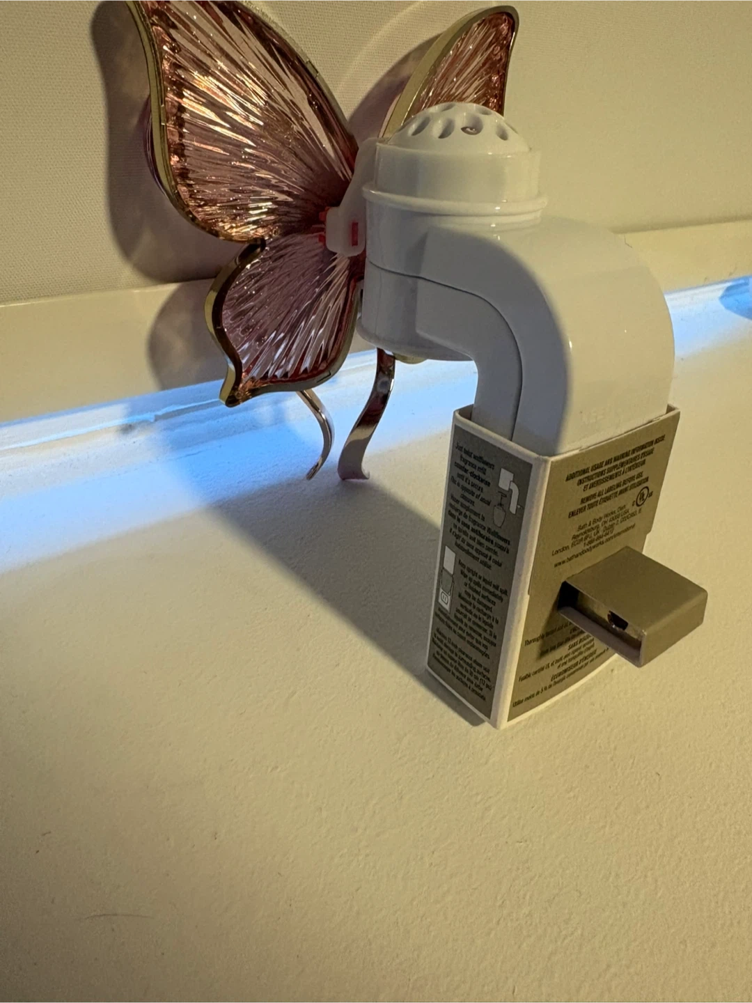 This is a Bath & Body Works Wallflower plug with a decorative butterfly design. It has adjustable settings for fragrance intensity. Plug it in to enjoy continuous scent in any room!