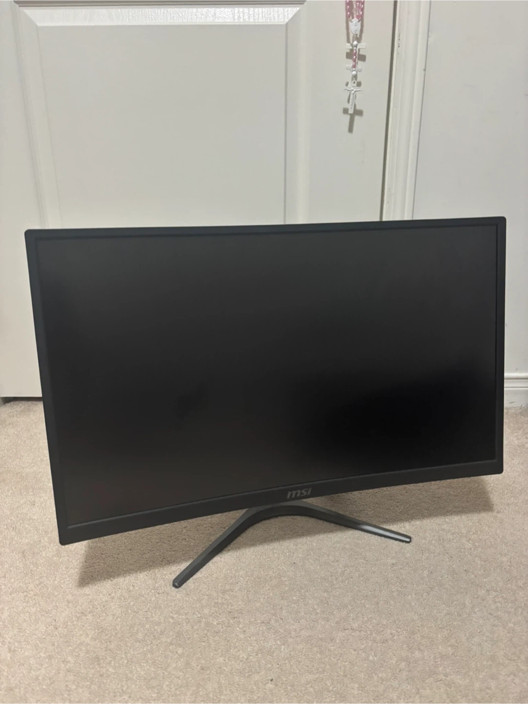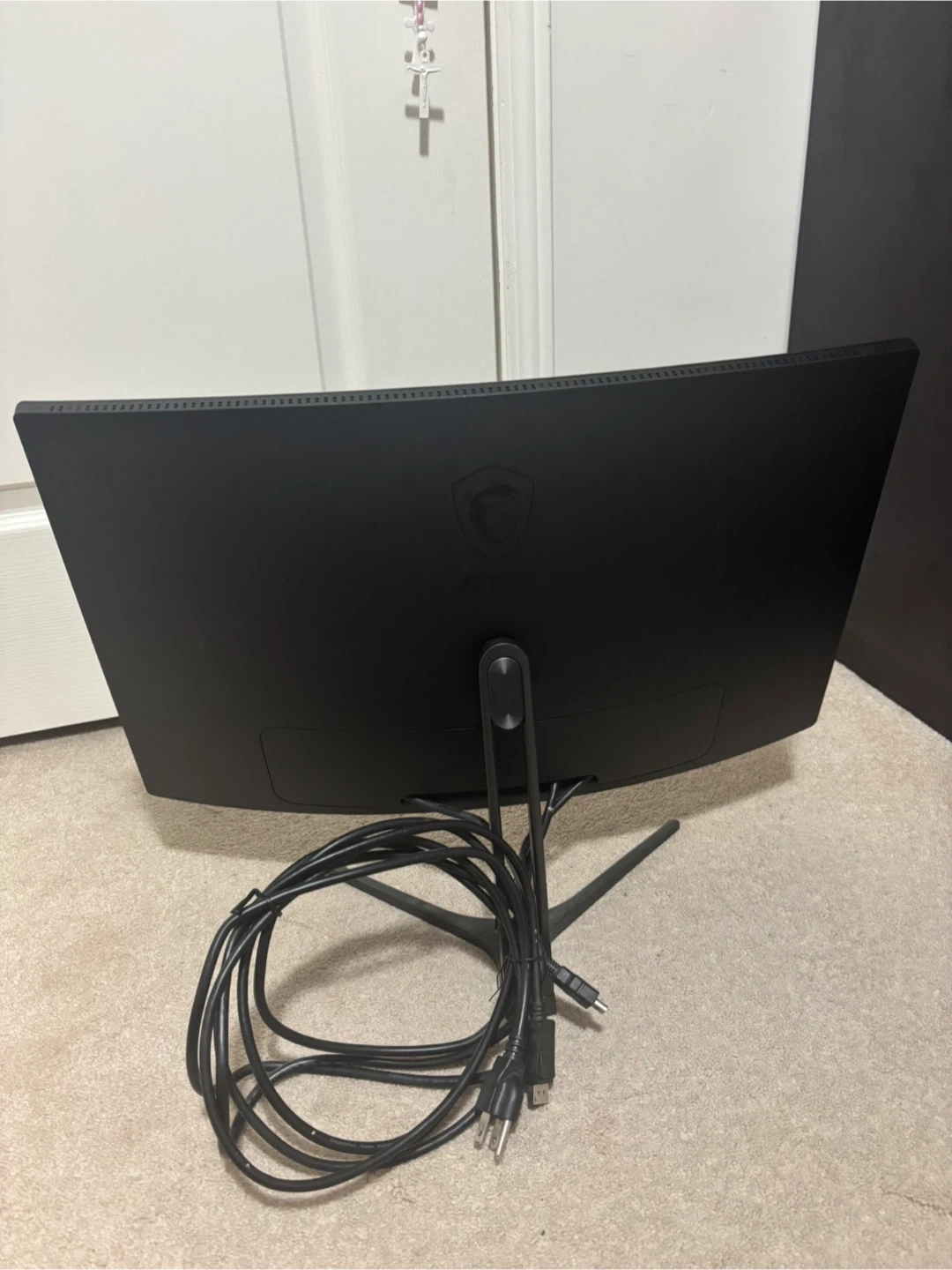 This is an MSI monitor with a sleek black design. It comes with a stand and necessary cables. Great for gaming and everyday use! Its adjustable and is 24 inches with 144 hz.
