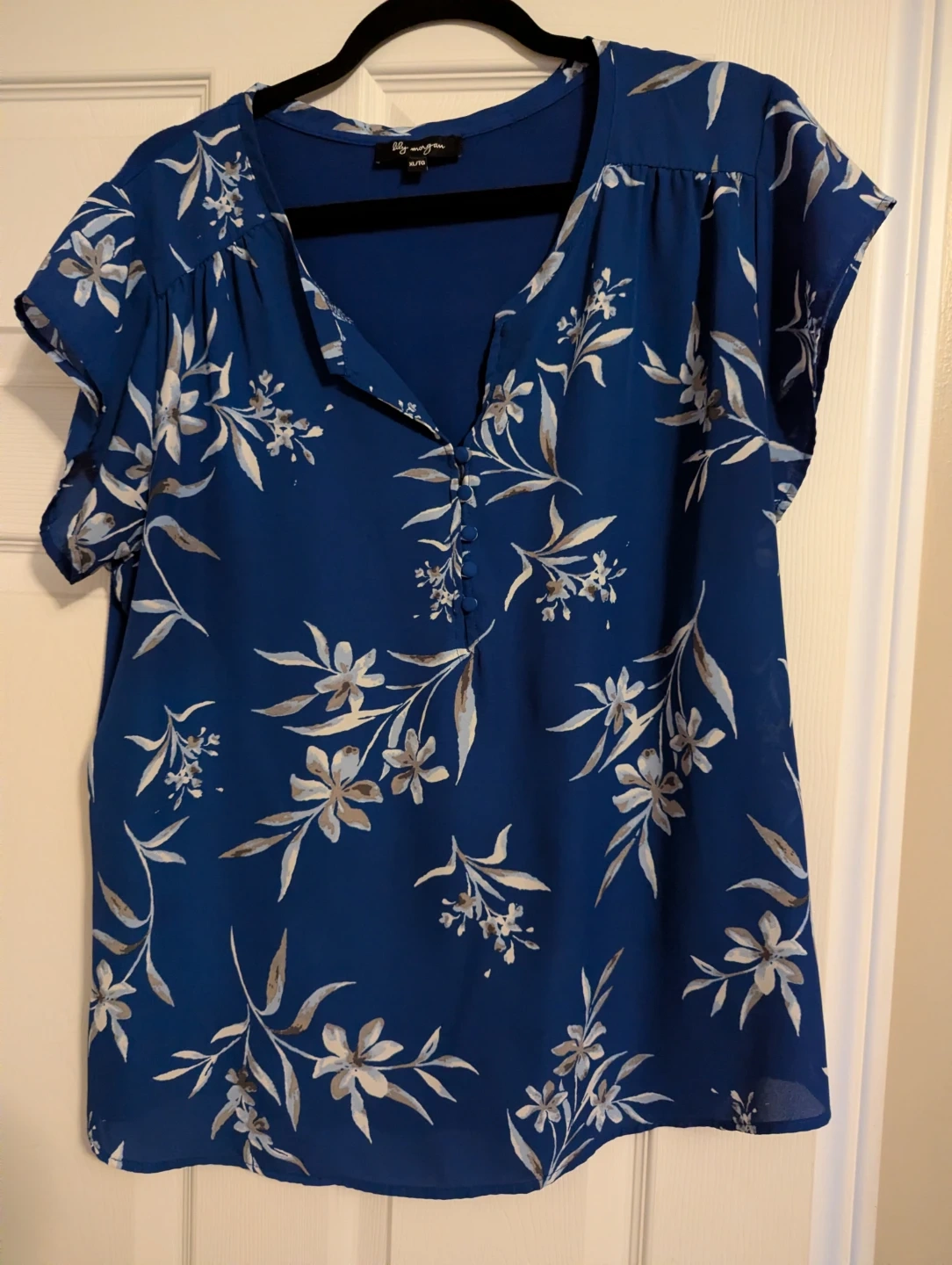 Lily Morgan V-neck blouse with a blue floral pattern. It has short, fluttery sleeves and a button-front detail. Size XL/TG. SFH