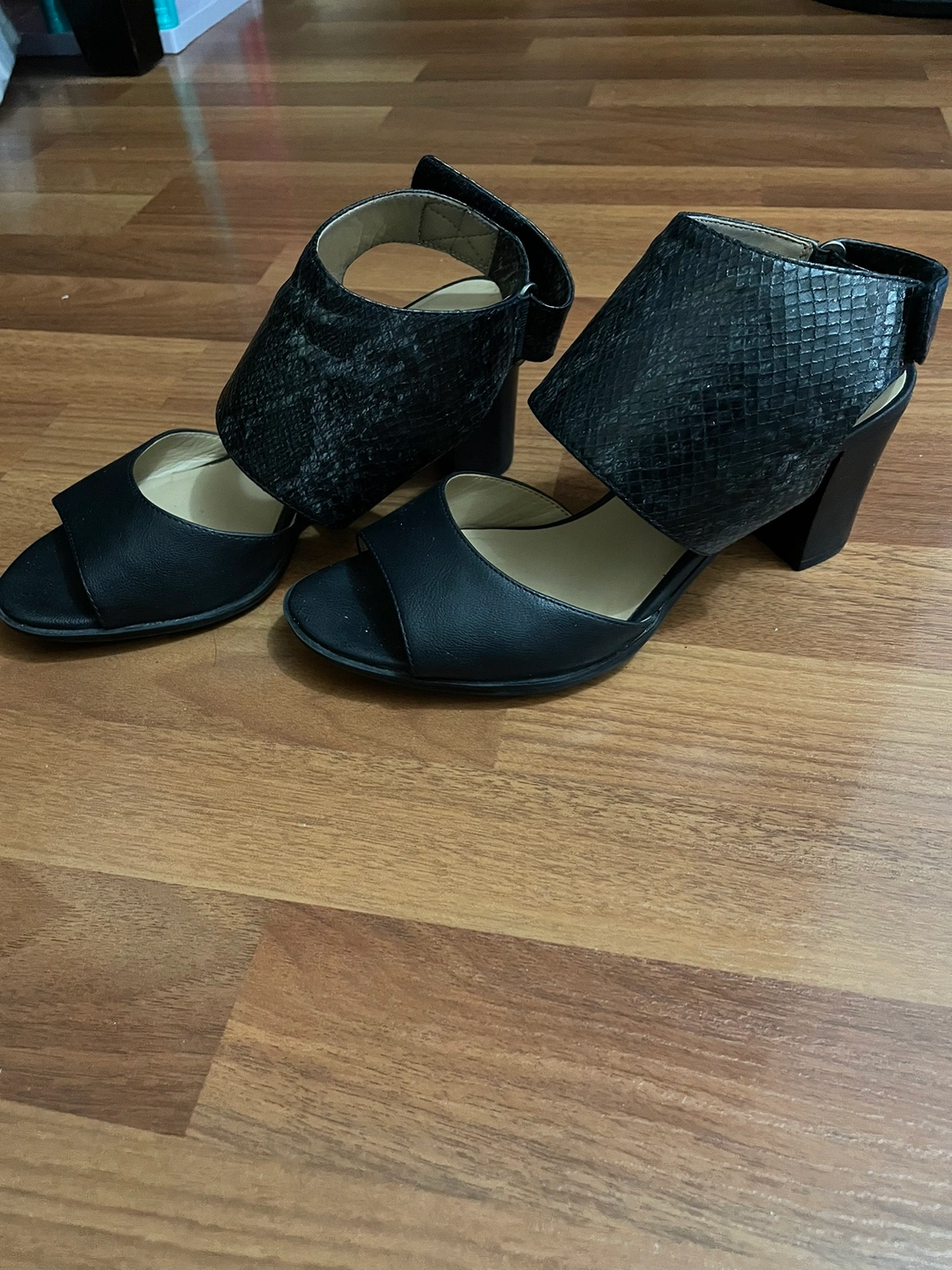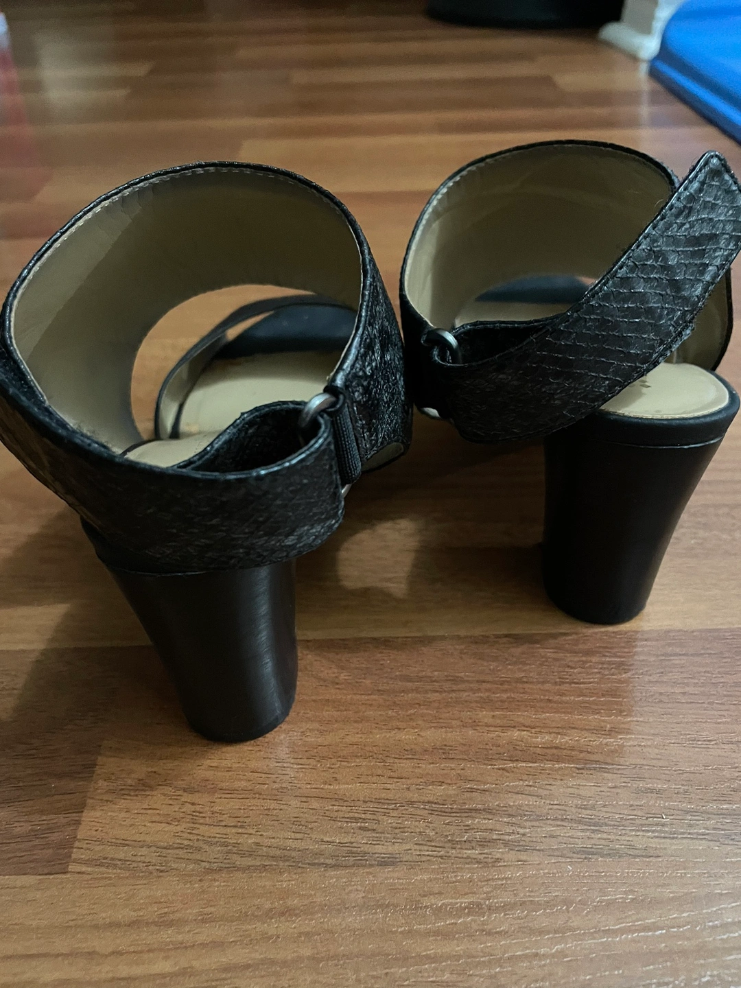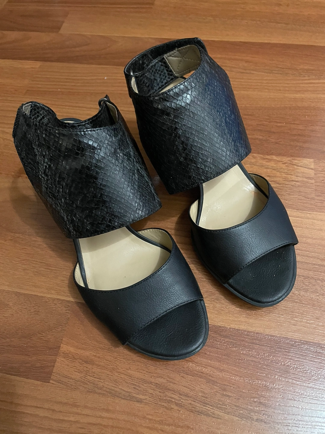 Size 6.5 Black leather heels with a snakeskin pattern on the front. and have an ankle strap.