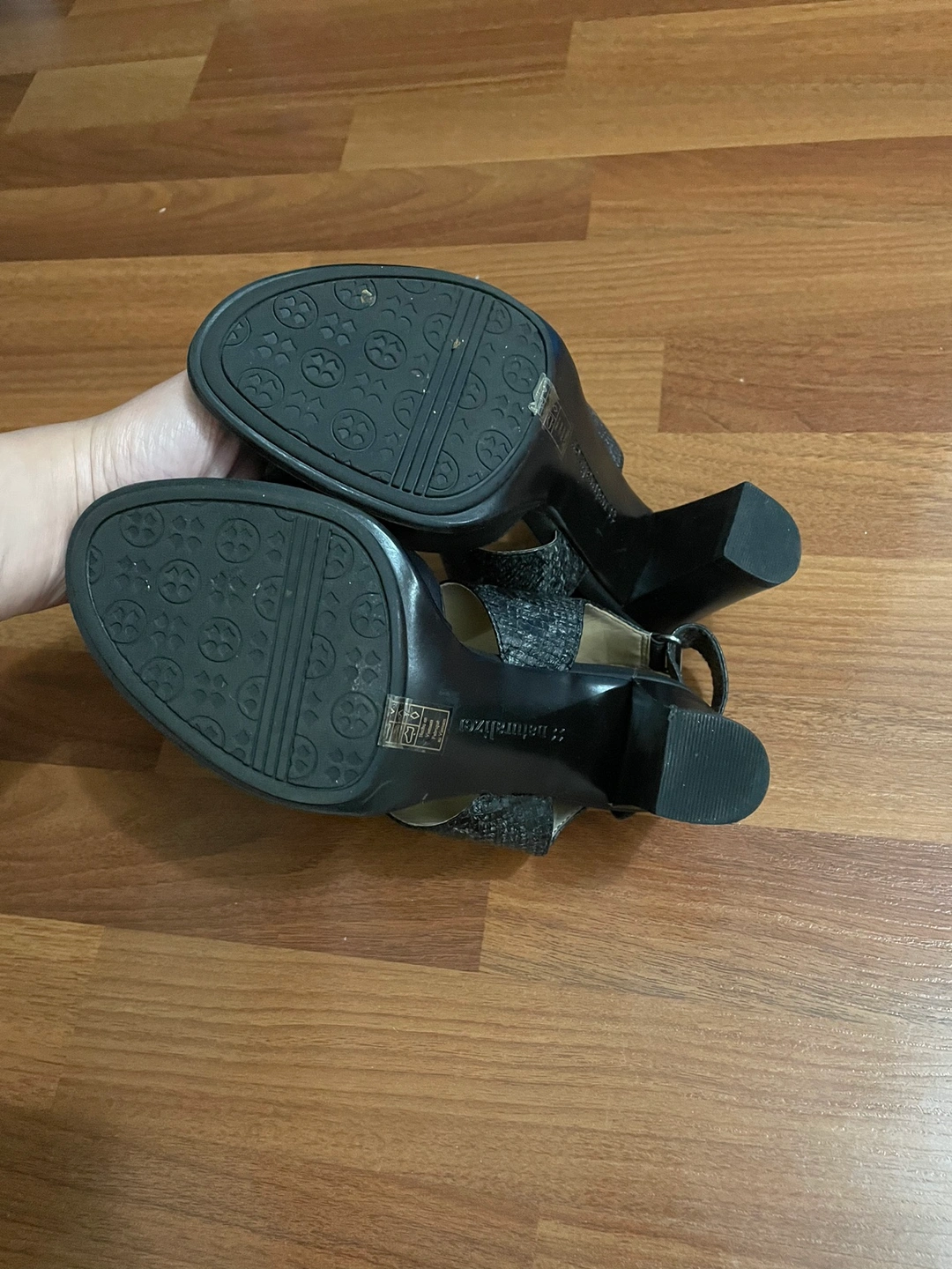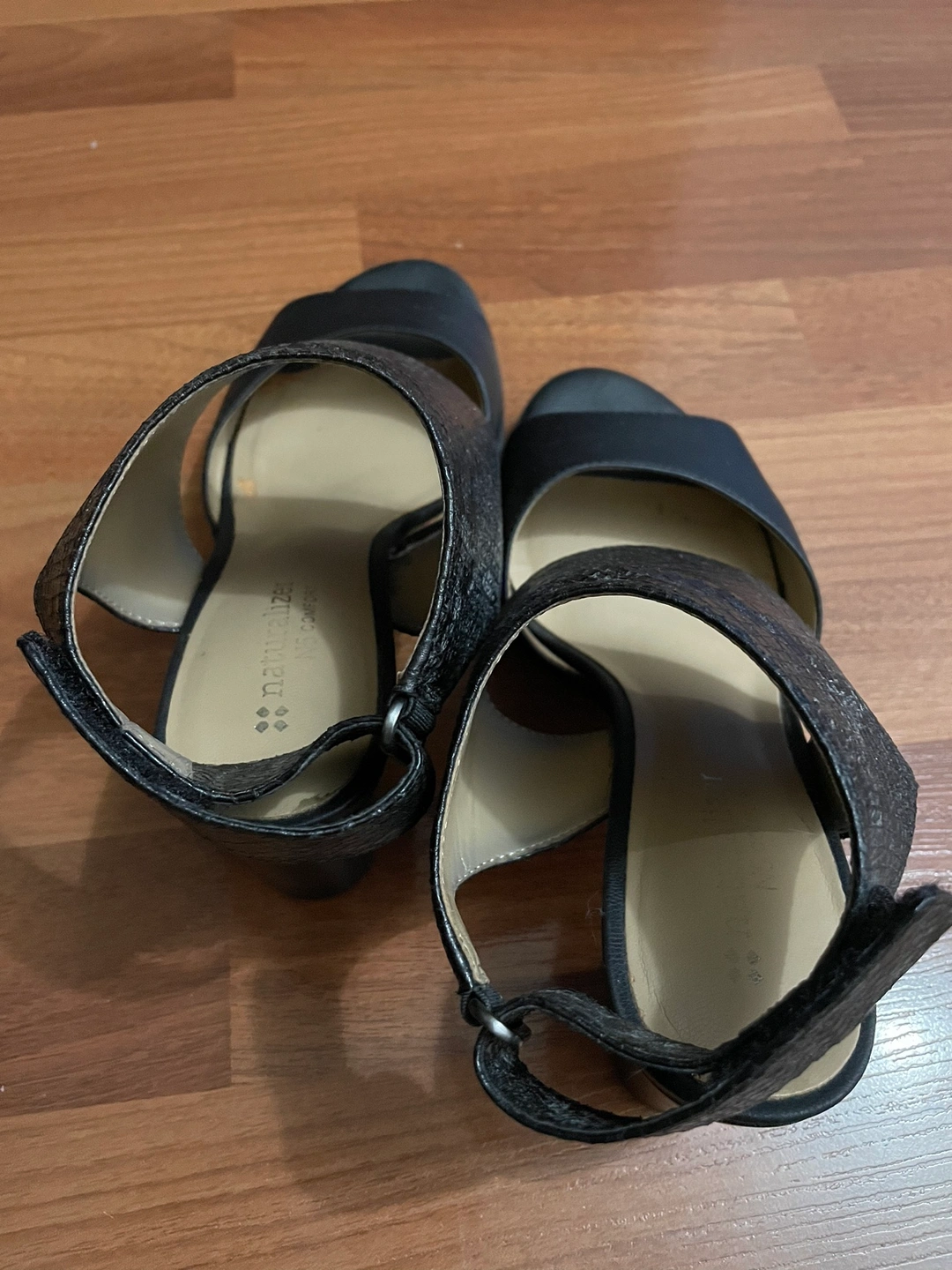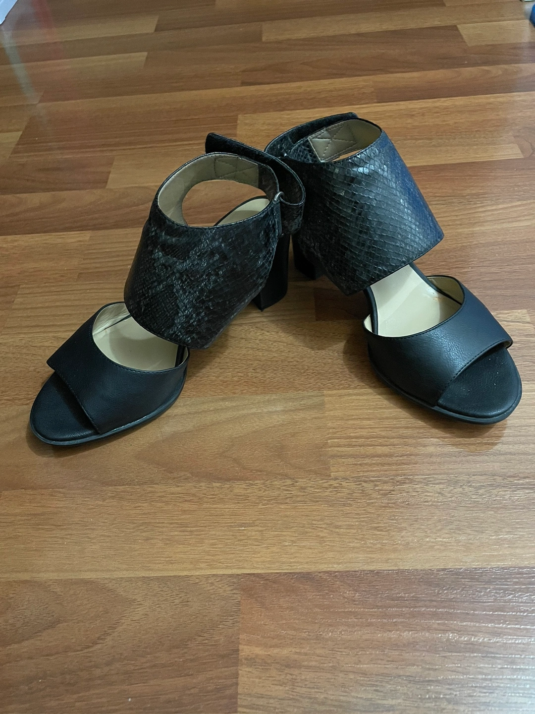 Size 6.5 Black leather heels with a snakeskin pattern on the front. and have an ankle strap.