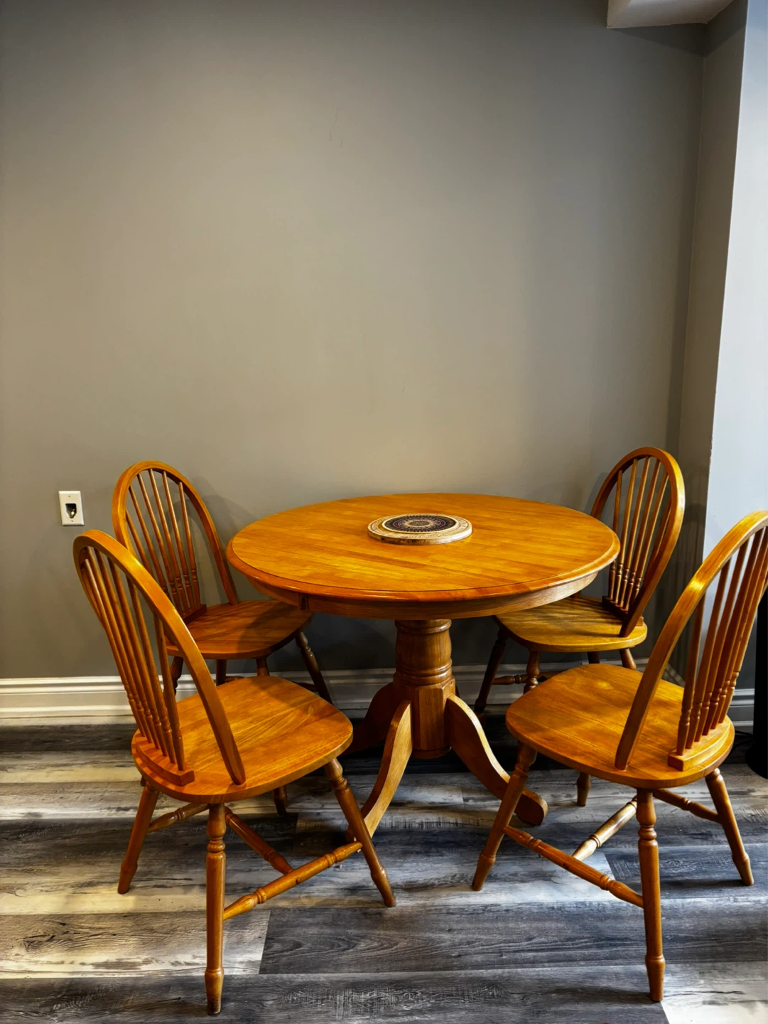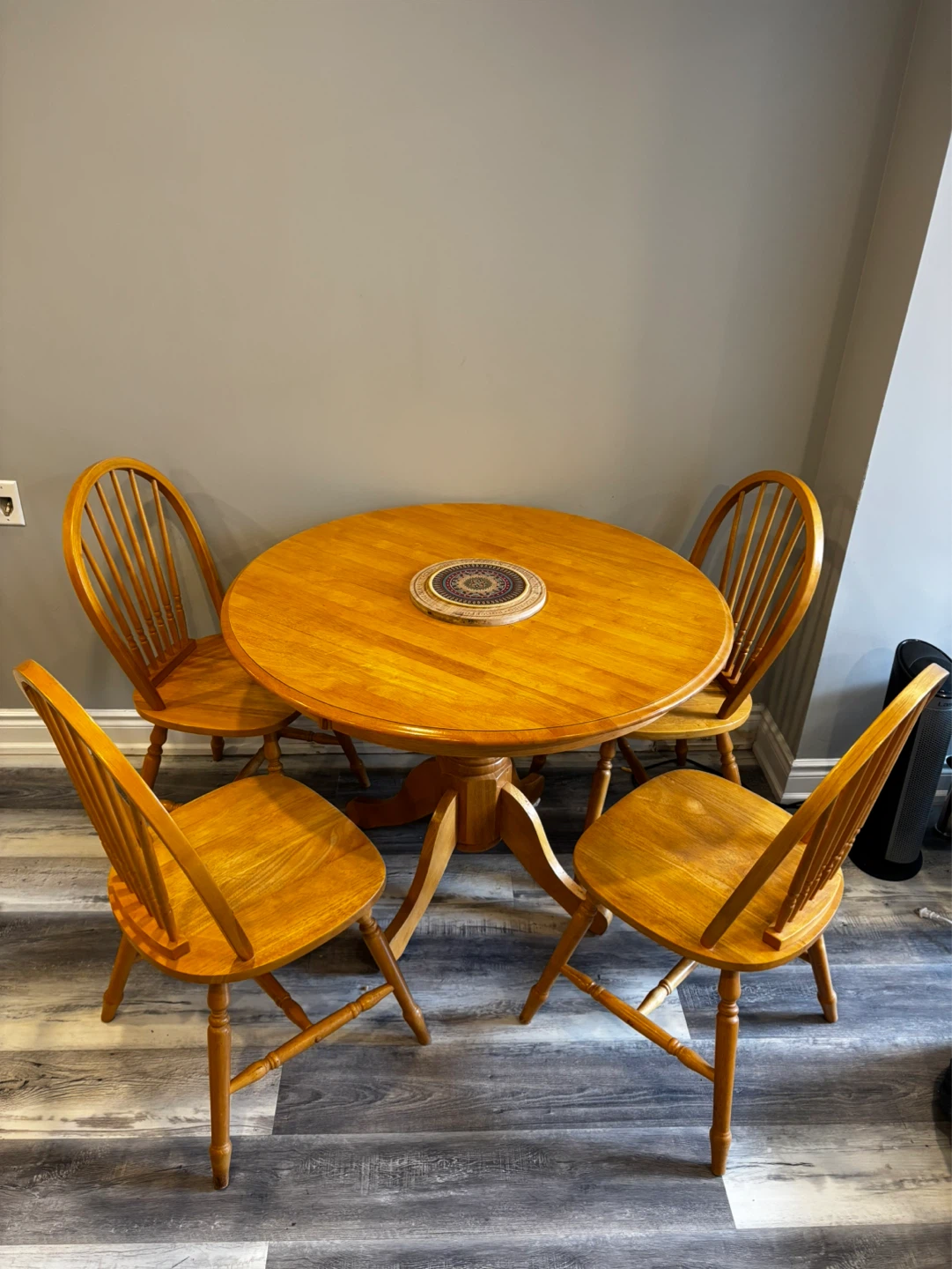 This is a classic wooden dining set, perfect for smaller spaces or a cozy kitchen nook. It includes a round pedestal table and four matching chairs with spindle backs. The warm wood tone adds a welcoming feel to any dining area.