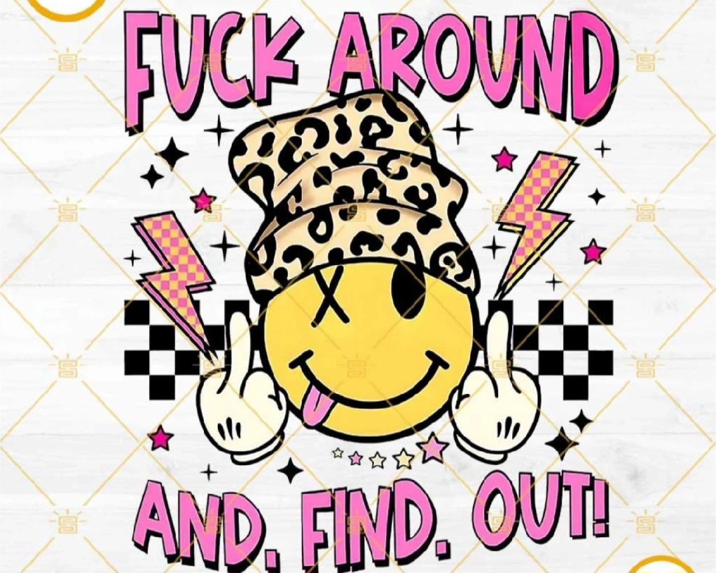 This navy blue hoodie features a bold graphic with a smiley face, leopard print hat, and the phrase "Fuck Around and Find Out!". It's a comfortable pullover with a front pouch pocket. A great way to show off some attitude! Hoodies $35.00, we can put whatever you want on yours.