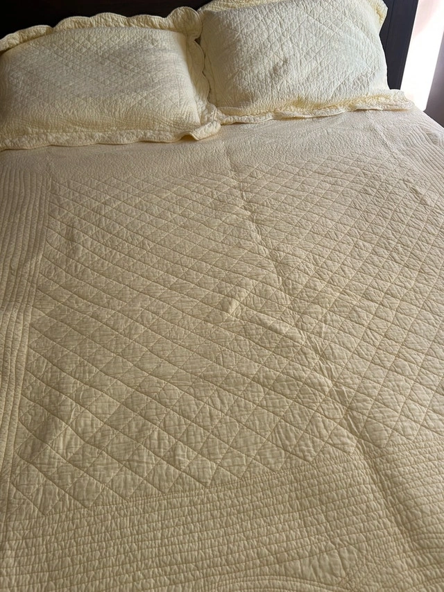 New condition, very clean, never used. Bright yellow, queen size quilted bed spread.