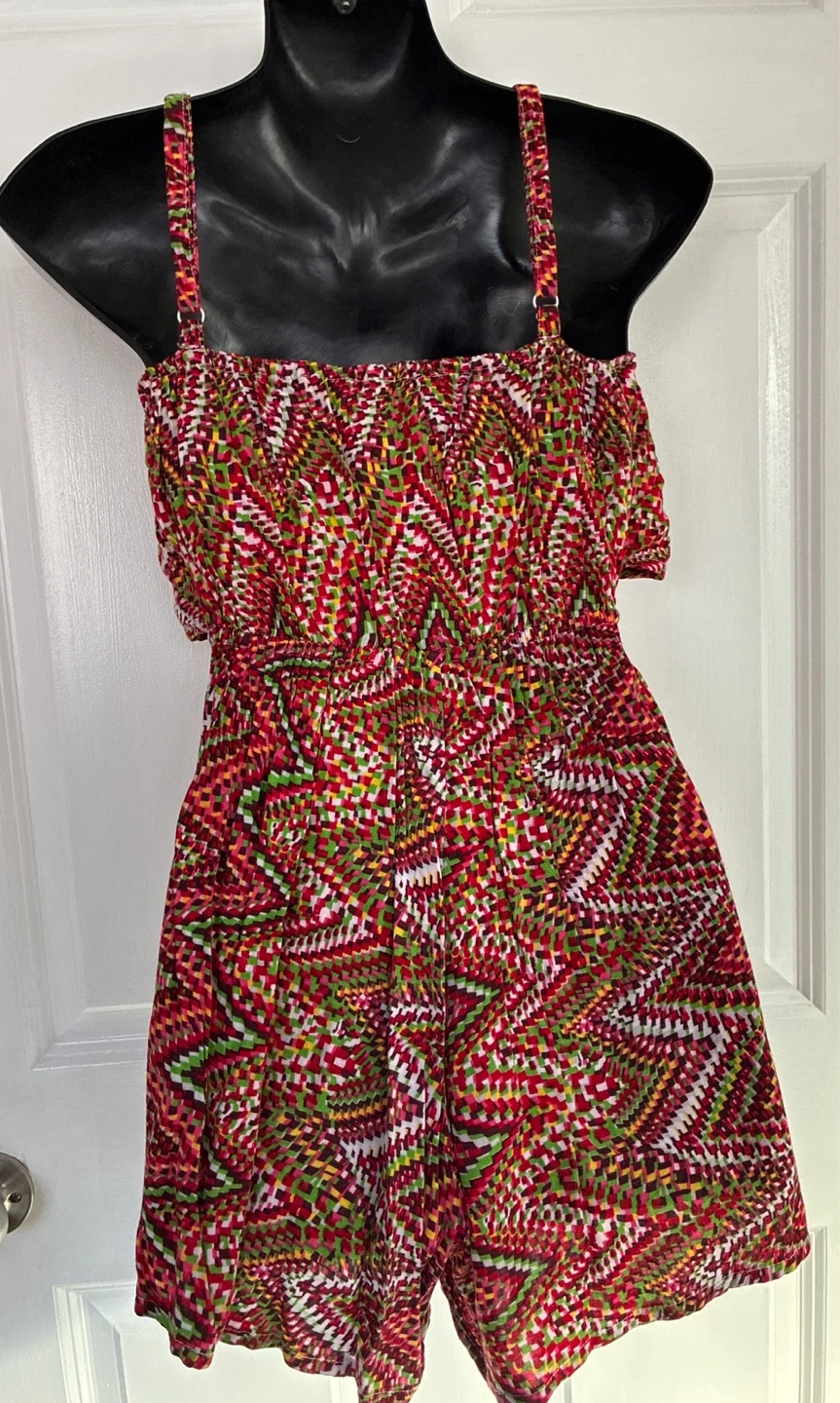 This women's romper features a vibrant abstract print. It has adjustable straps and a comfortable elastic waist. Made from a lightweight fabric, it's perfect for warm weather!