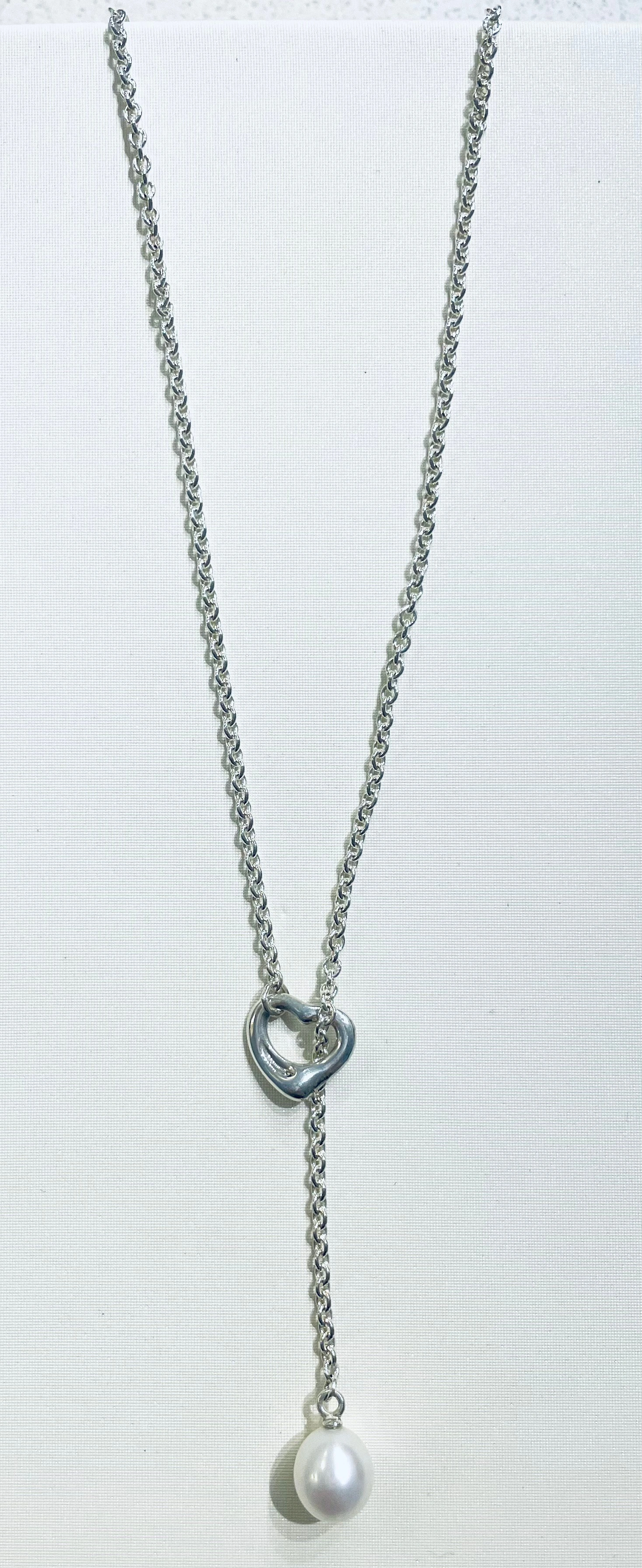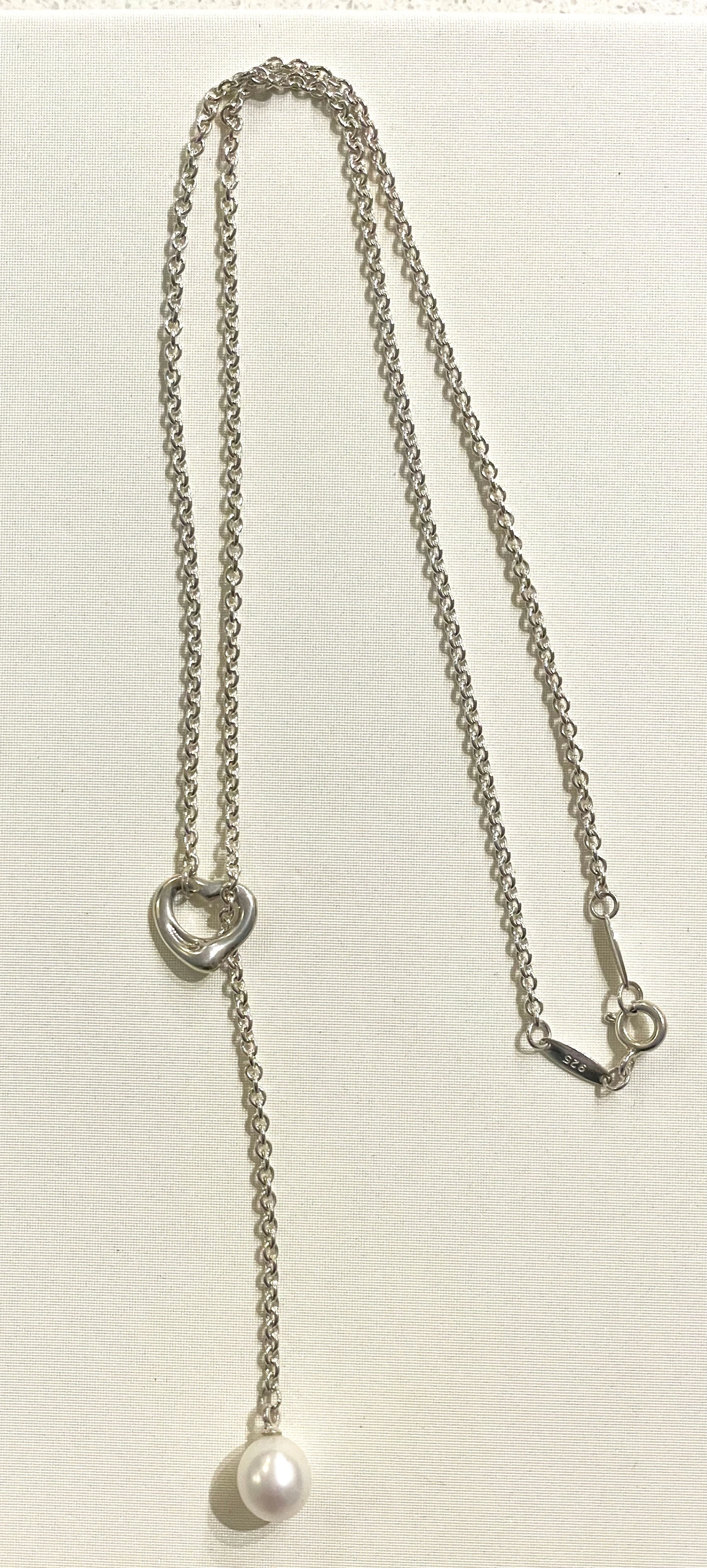 Authentic Tiffany & Co. necklace from the iconic Elsa Peretti Open Heart collection. This is a stunning lariat-style necklace in .925 sterling silver, featuring a 9–9.5 mm freshwater cultured pearl. The Open Heart design was first introduced in 1974 and remains one of Tiffany's most beloved and enduring collections.