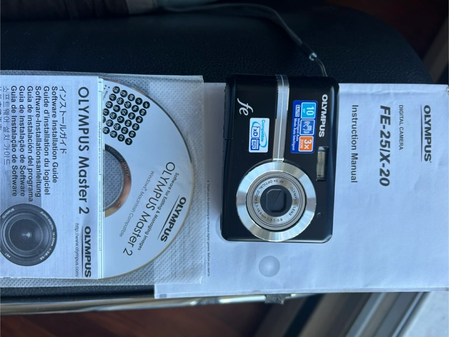 Olympus FE-25/X-20 digital camera. Includes Olympus Master 2 software for editing and managing images. Comes with instruction manual and software installation guide.