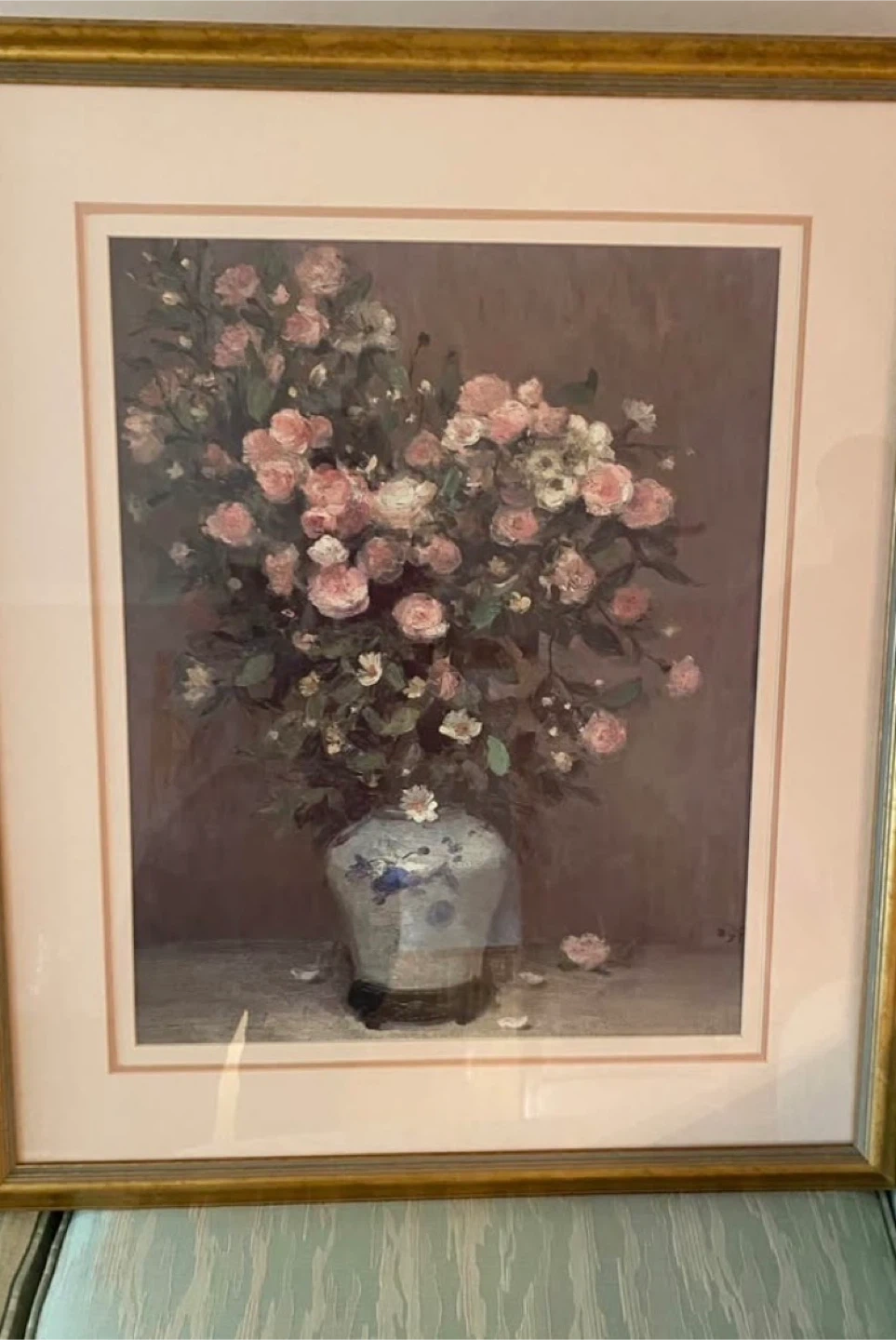 A lovely framed print featuring a floral arrangement. The frame is a gold colour with a light pink border. It would look great in any room!