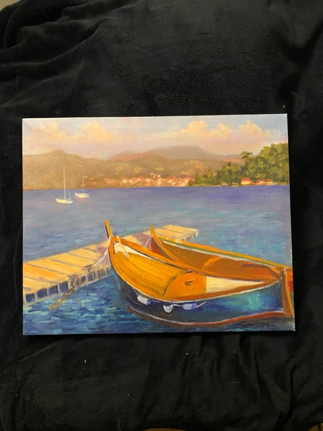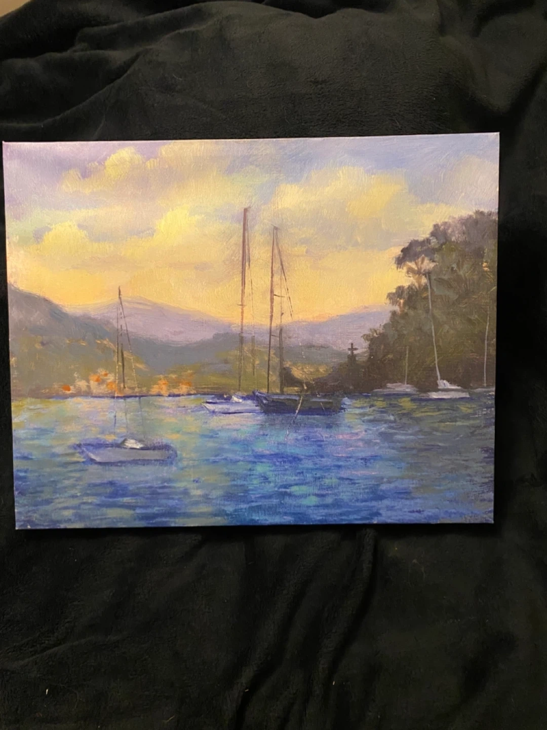 This is an oil painting on canvas depicting sailboats in a calm harbour at sunset. It showcases a serene maritime scene with beautiful hues of blue and yellow. The artwork captures the tranquility of the water and the warm glow of the sky.