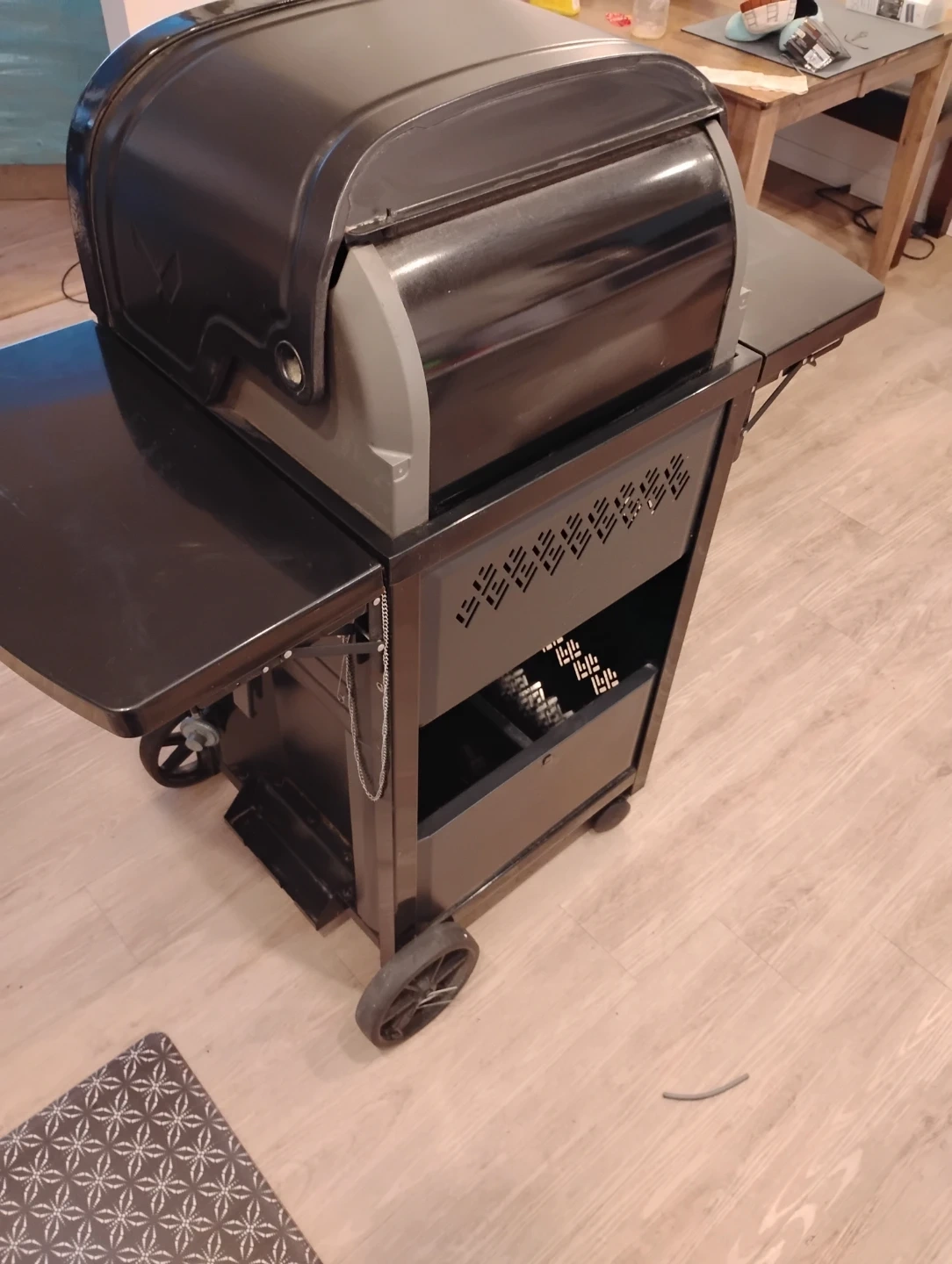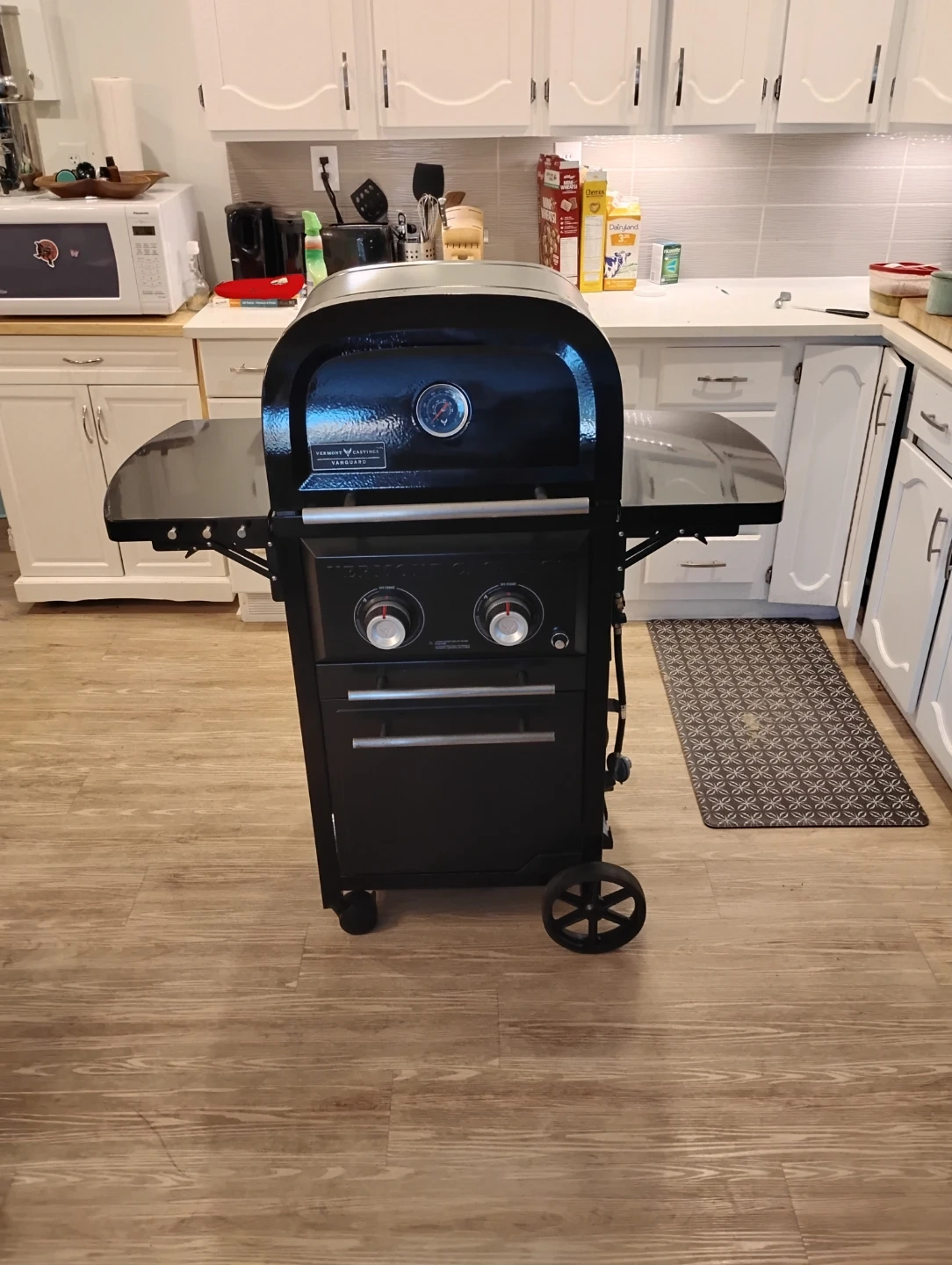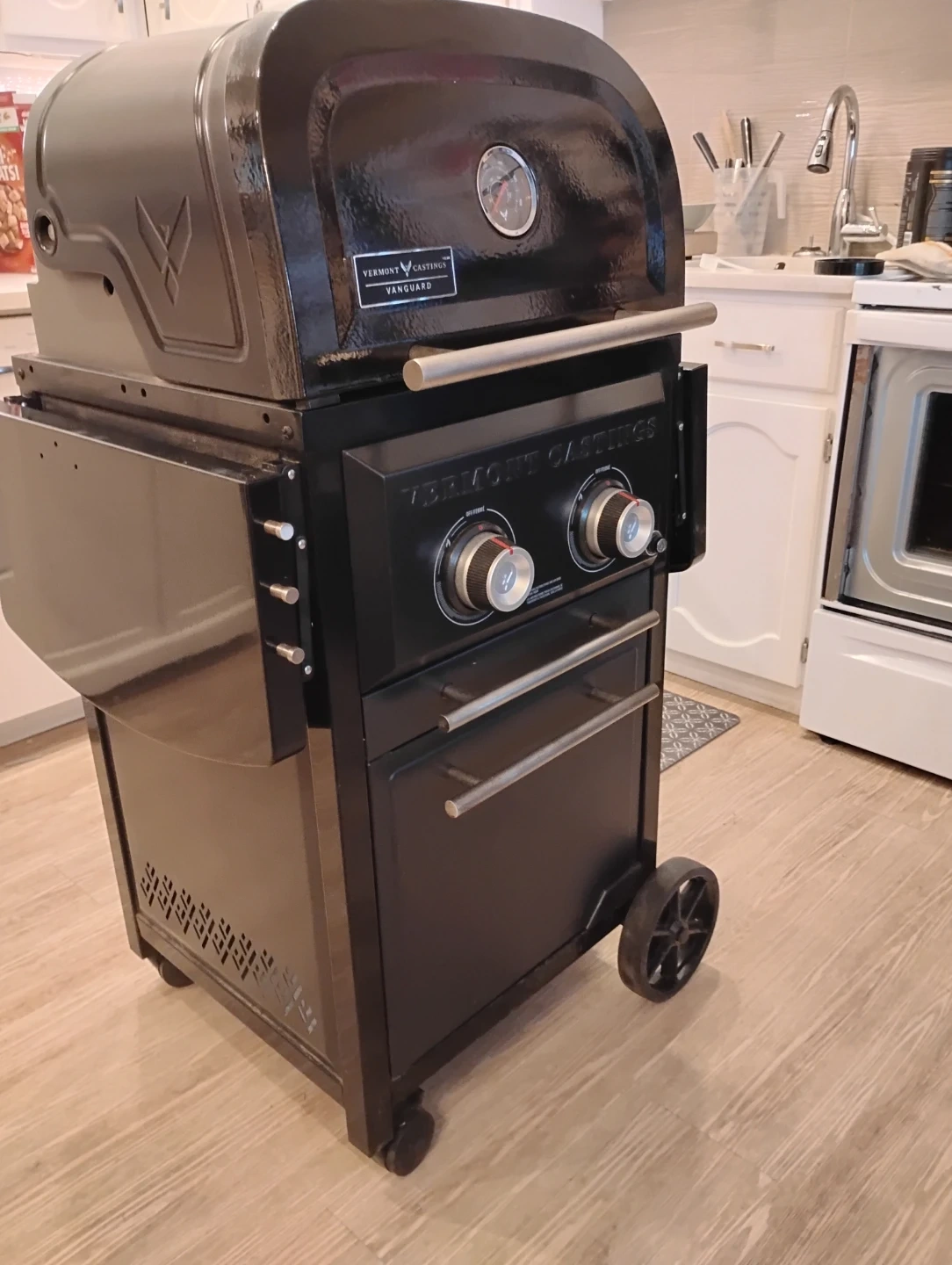 This is a Vermont Castings Vanguard propane grill. It's black and comes with side shelves. It has two burners and storage drawers. It's on wheels for easy moving. used half dozen times. paid $850