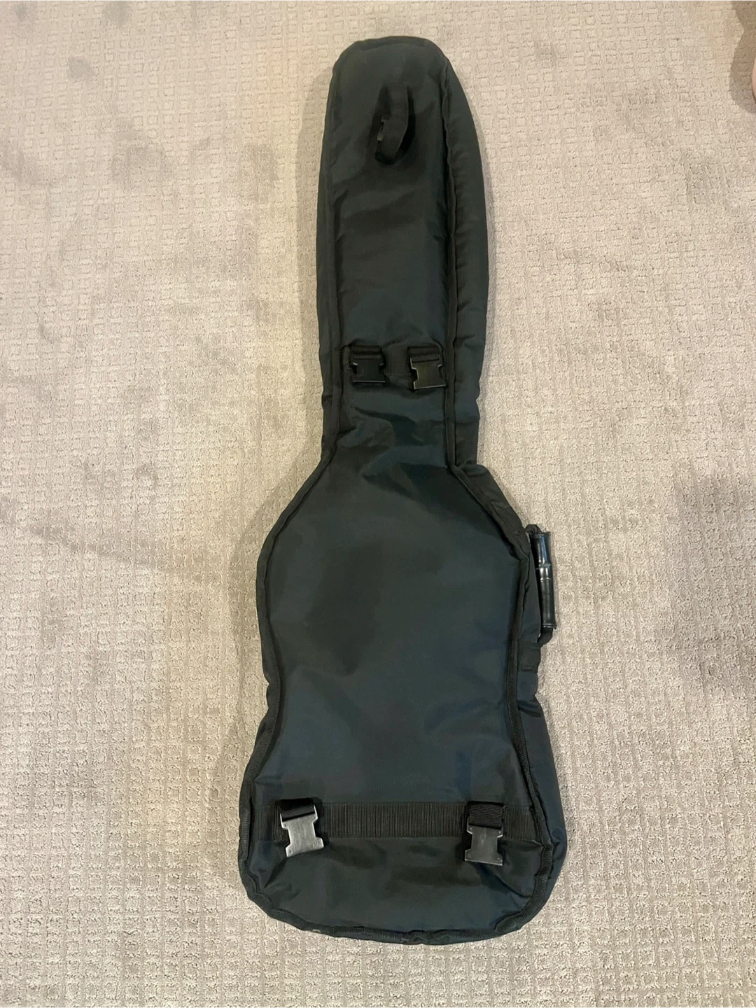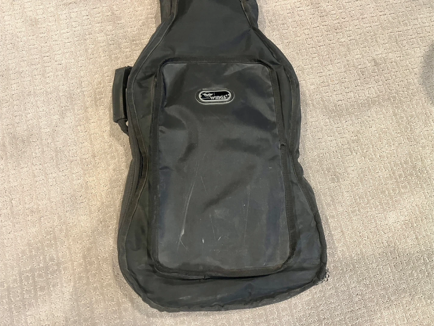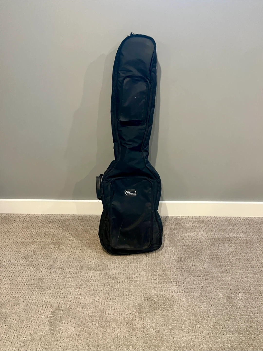 Wings brand soft case for a standard sized electric bass guitar. Will fit Fender Precision and Jazz size basses and many others. It measures about 47” long, 14” at its widest point and 4” deep. It’s an older case and has some sun fading but the zippers work and has decent padding. Unfortunately the backpack straps are missing so it just has the main carry handle. Has two zippered pockets on the outside, one small and one large. Feel free to bring your bass along to make sure it will fit.