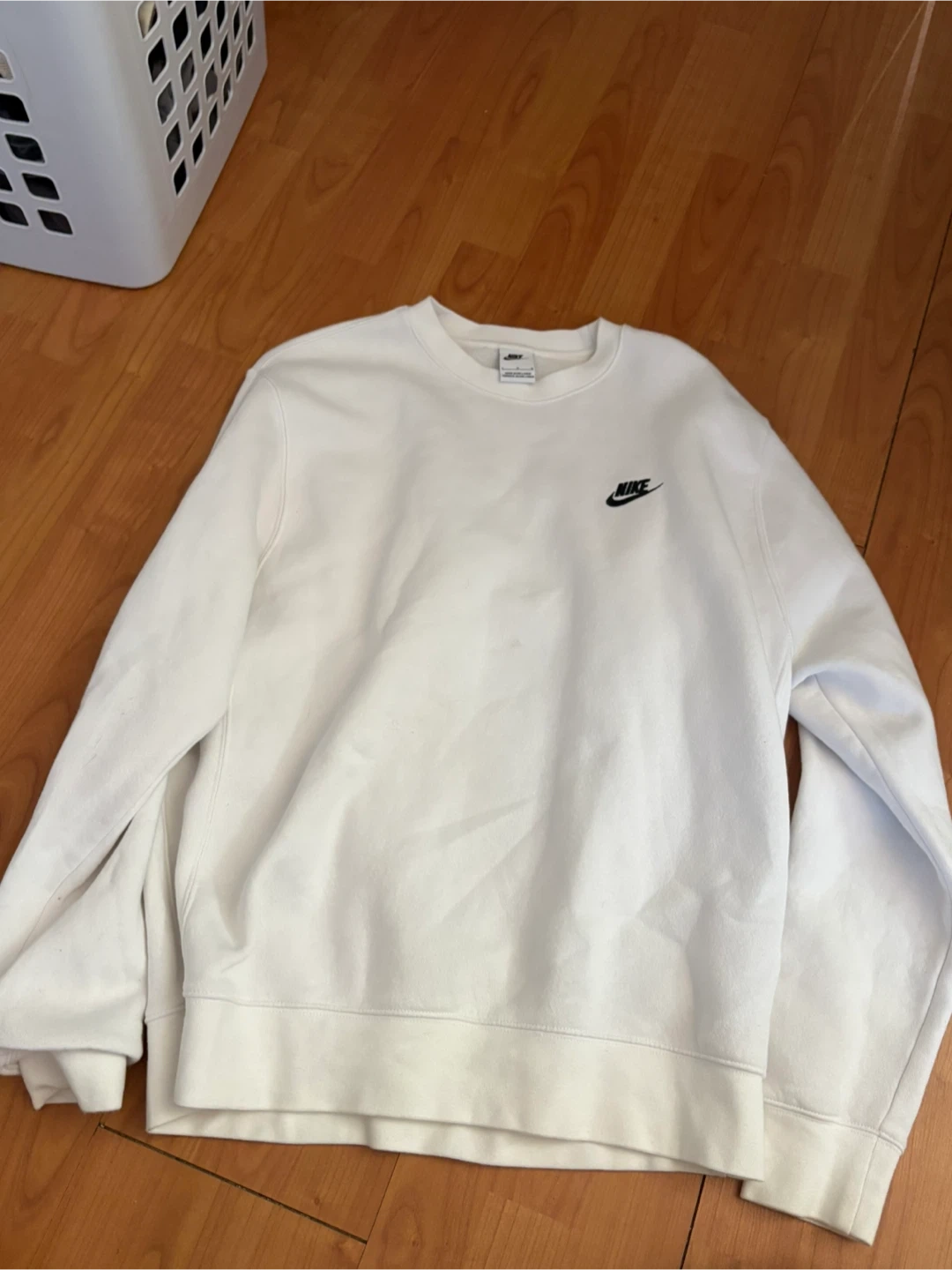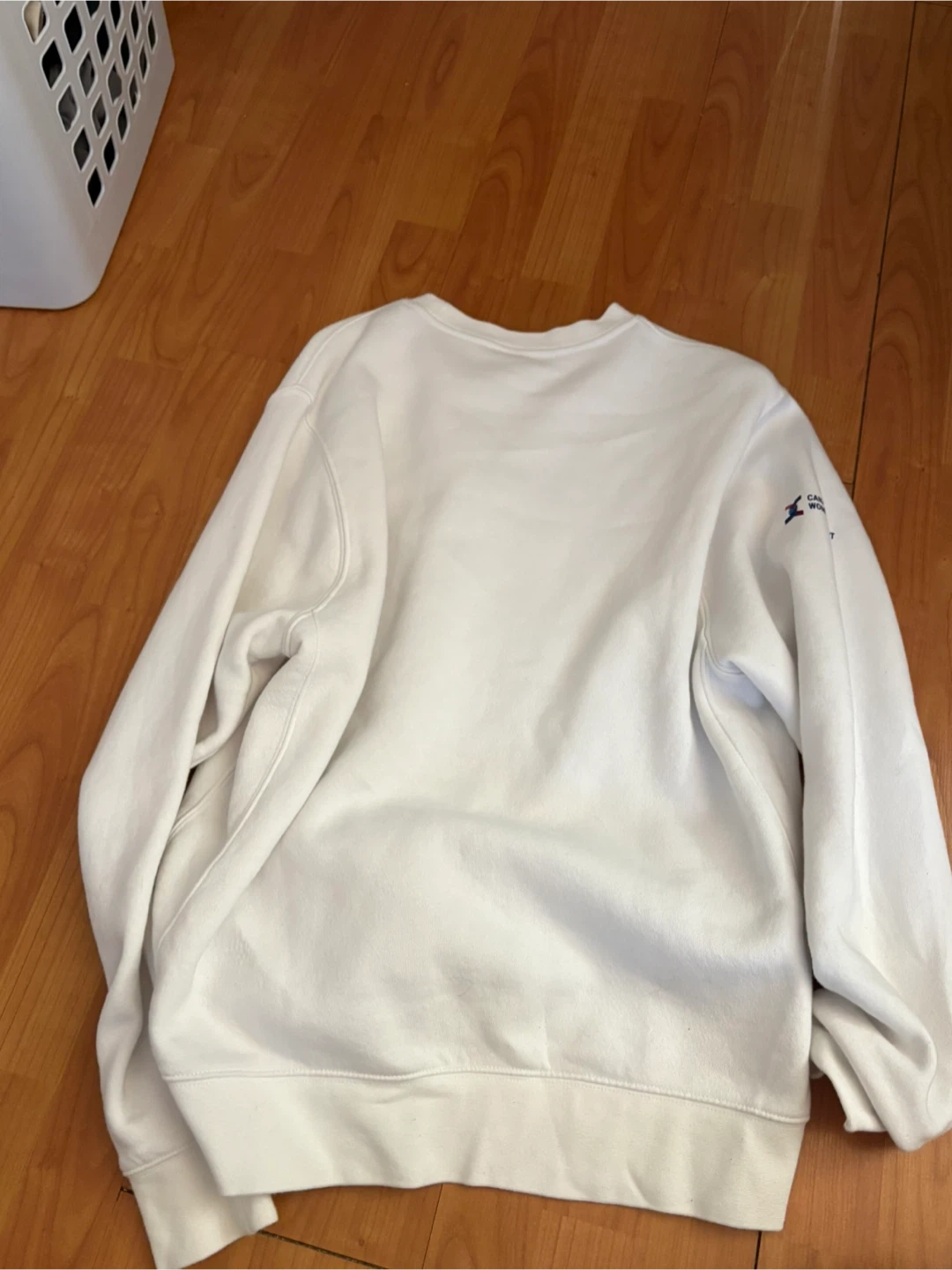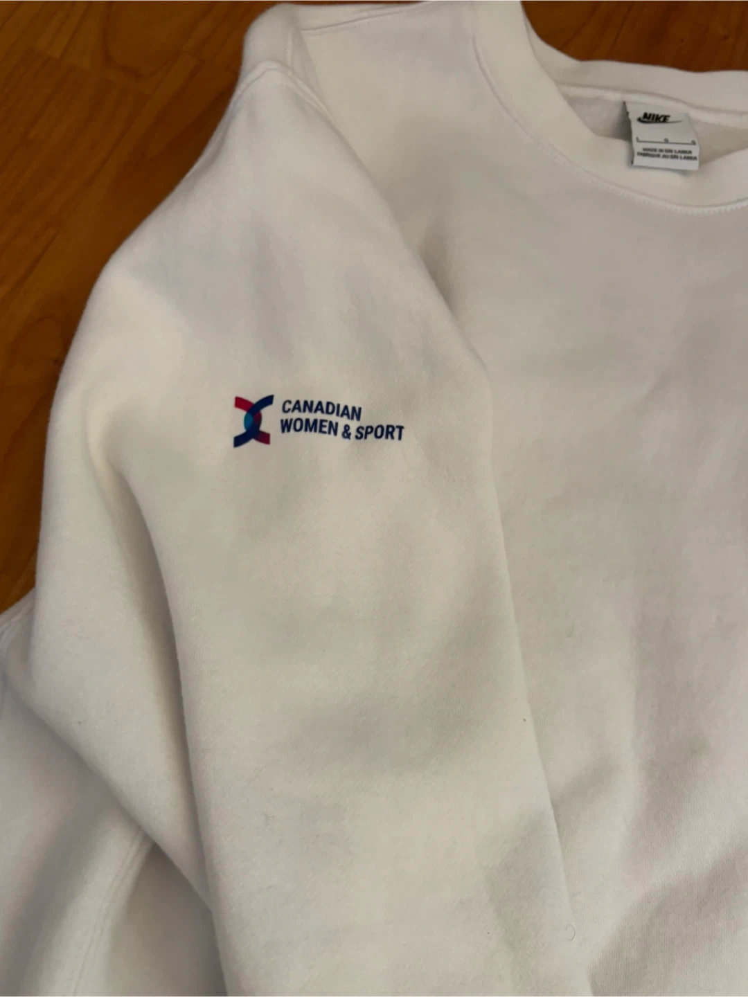 This is a white Nike crewneck sweatshirt. It features a small embroidered Nike logo on the front and a Canadian Women & Sport logo on the sleeve. Made from a soft, comfortable material. Small stain that has a good chance of coming out on front