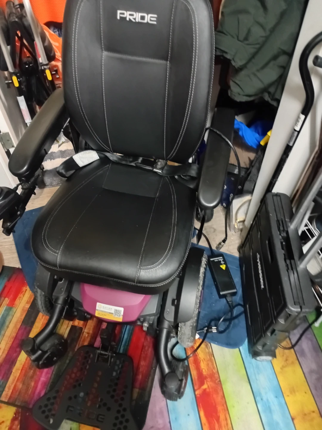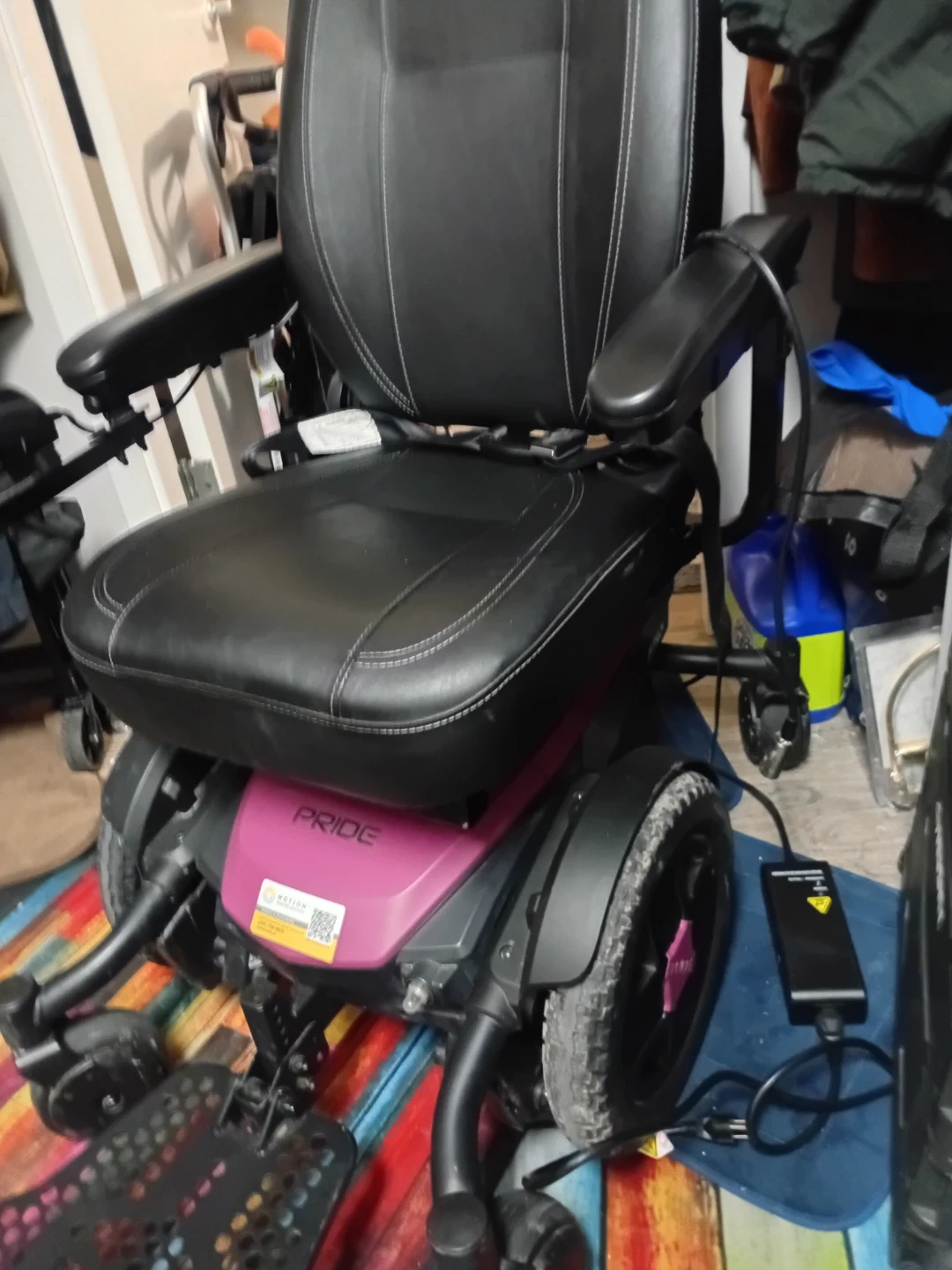 Black leather power wheelchair by Pride. It's in brand new .... never used includes charger. Full owner's manual no tip six wheel system. This chair offers excellent mobility support for daily use. Purchased for wife she never wrote it and tragically passed away brand spanking new looking for less than half the price that we paid. No room to park must sell.