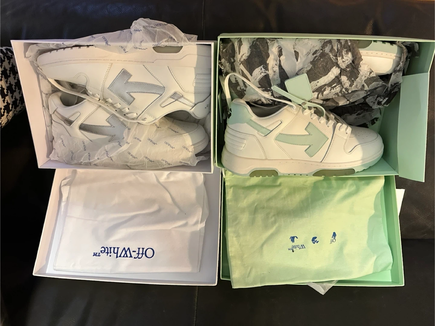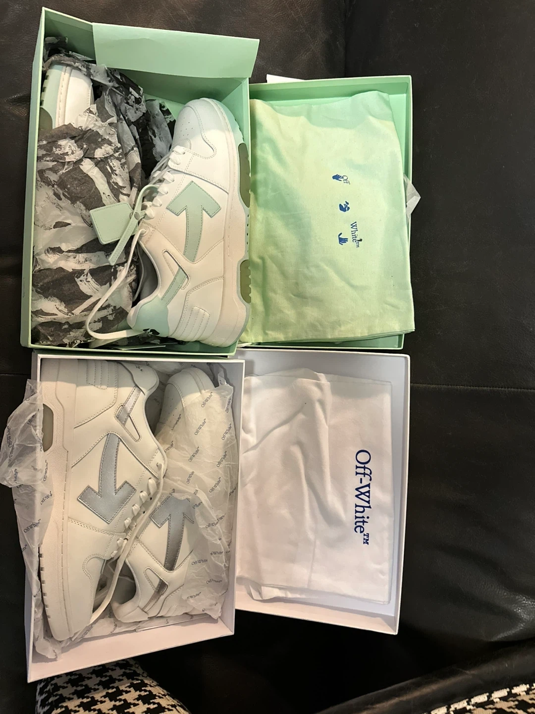 Selling a pair of Off-White Out Of Office sneakers. They are brand new and come in the original box. The shoes are white with a light blue/silver arrow logo. Great looking shoes!