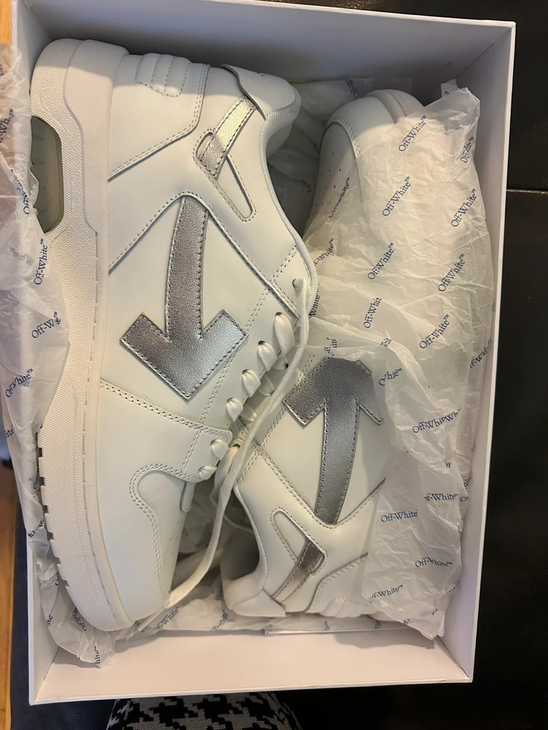 Selling a pair of Off-White Out Of Office sneakers. They are brand new and come in the original box. The shoes are white with a light blue/silver arrow logo. Great looking shoes!