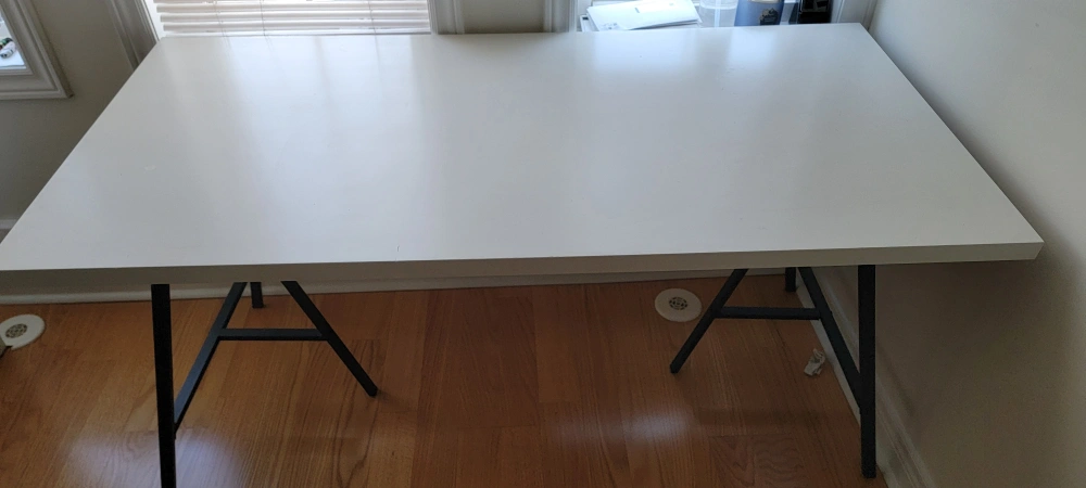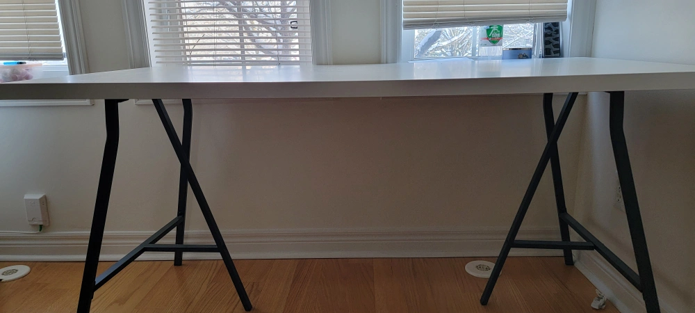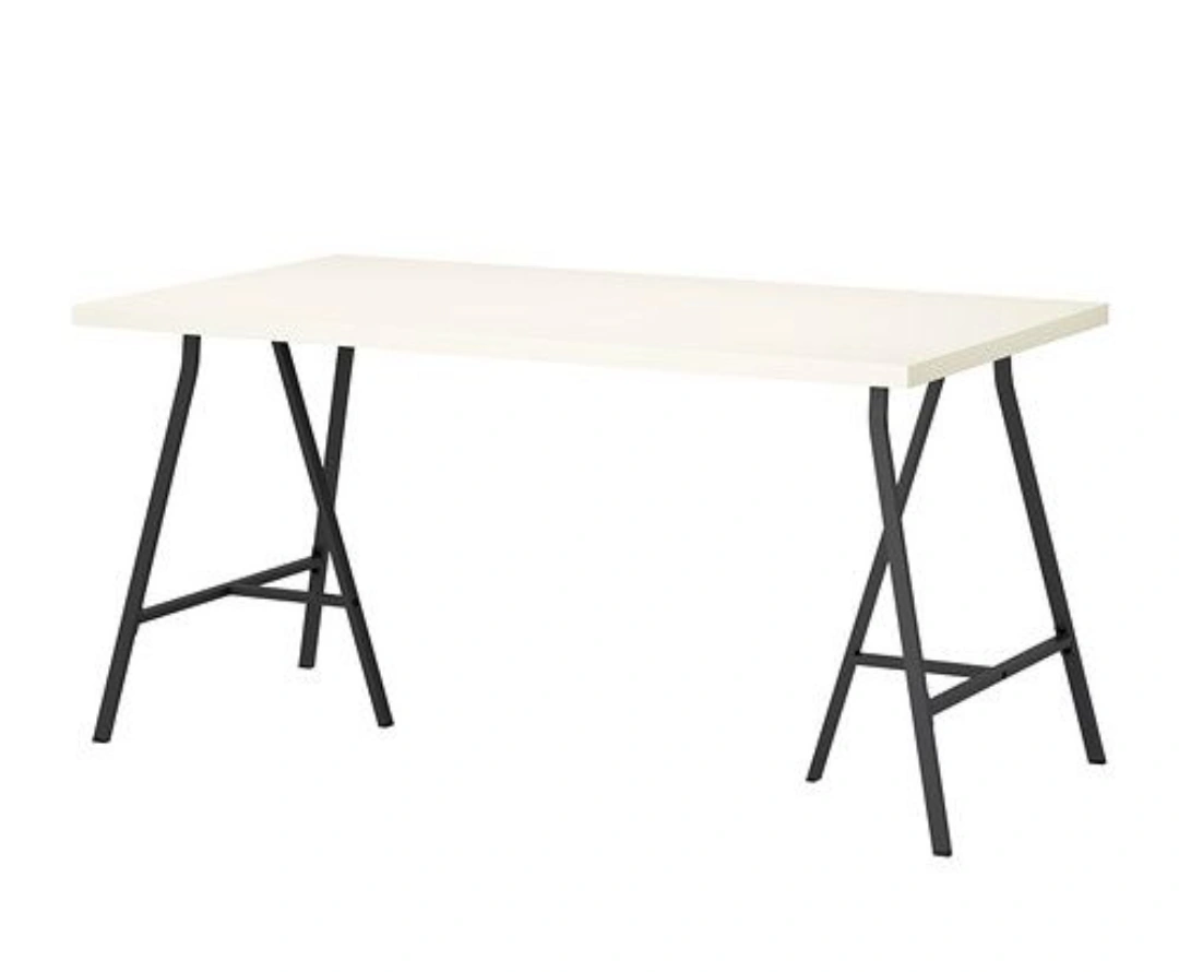 Simple, modern design. White tabletop and black metal legs. Great for home office or studio. Minimalist aesthetic. Durable and easy to assemble.