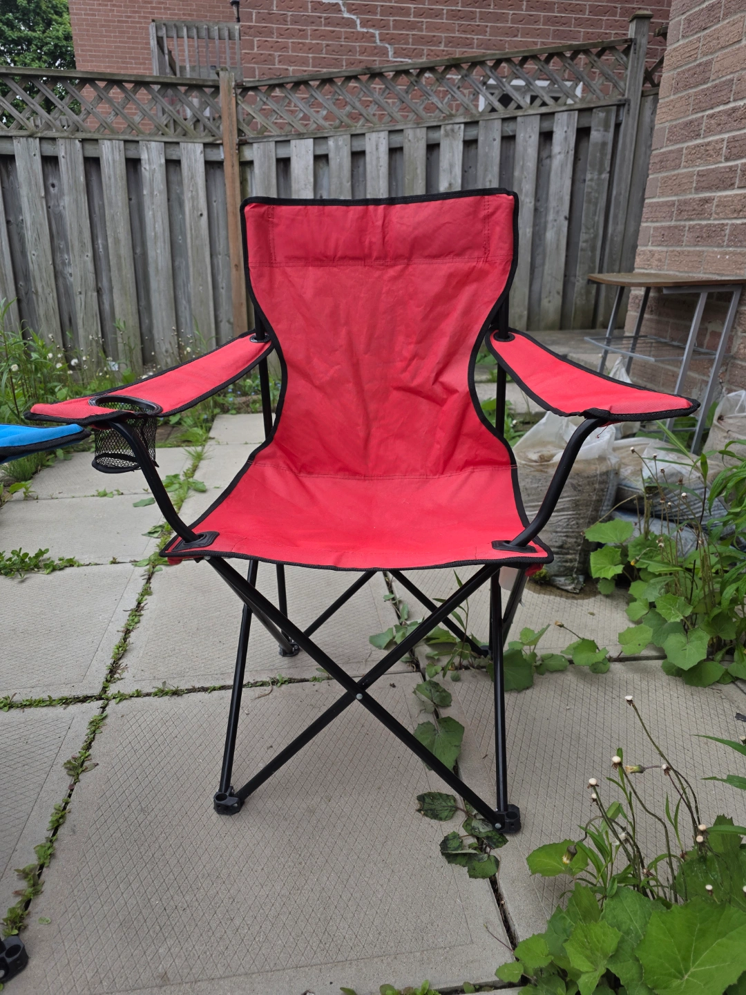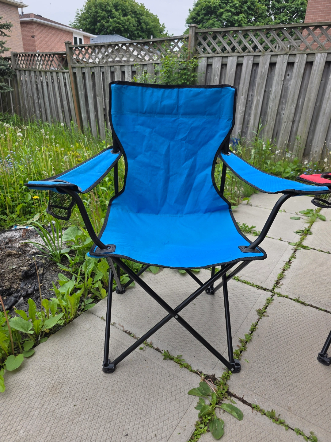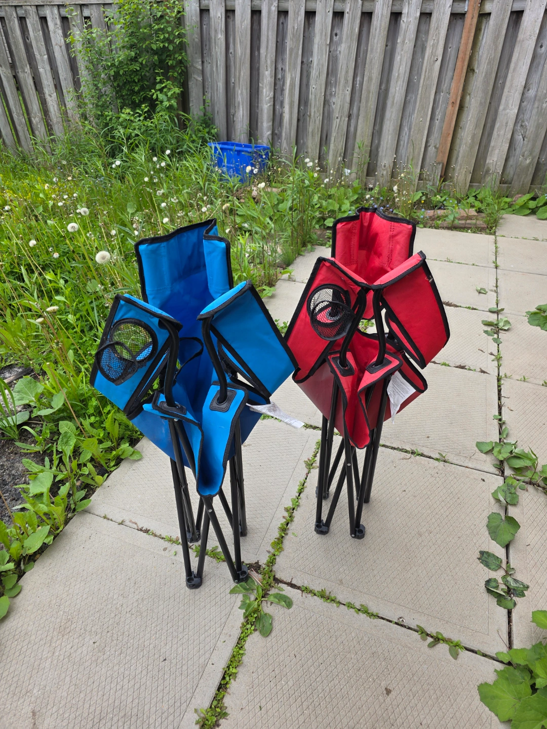 Two folding camping chairs. One blue, one red. Armrests and cup holders. Lightweight and portable, great for outdoor events. Easy to store.