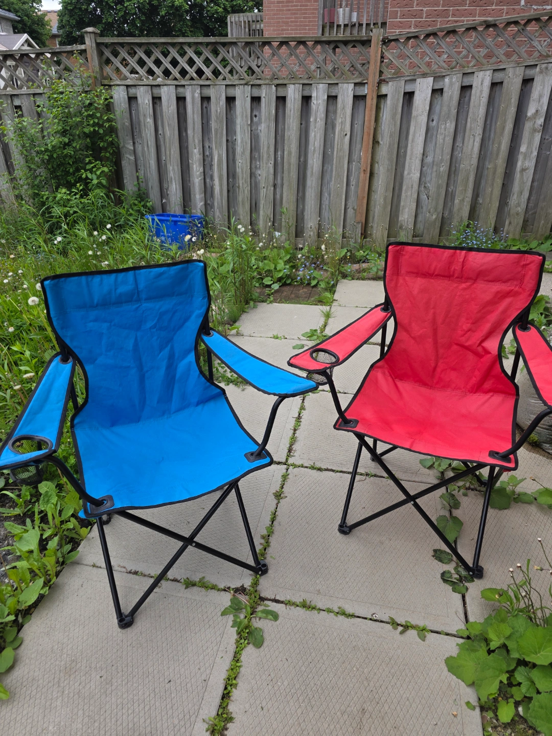 Two folding camping chairs. One blue, one red. Armrests and cup holders. Lightweight and portable, great for outdoor events. Easy to store.
