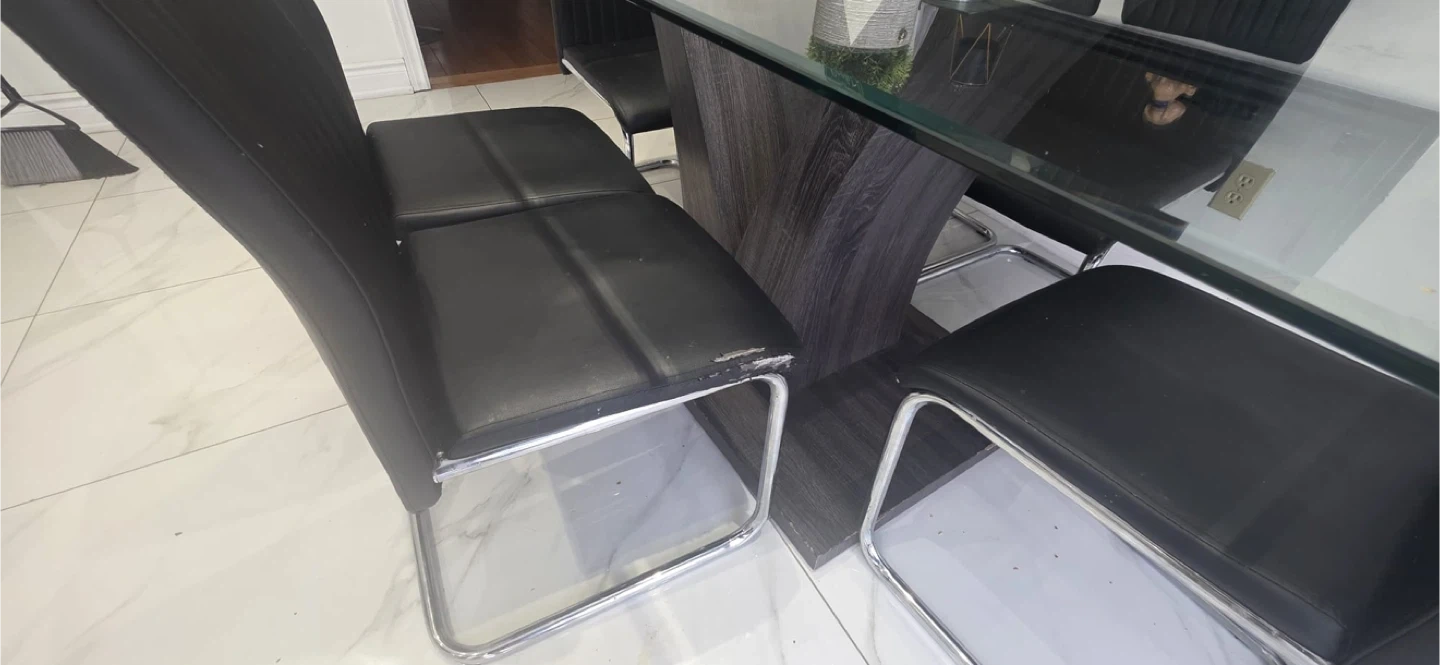 Modern dining set with a clear glass tabletop and a stylish dark wood pedestal base. It comes with six (6) black faux leather dining chairs with chrome legs. Some wear and tear on the chair upholstery is visible.🥕🥕