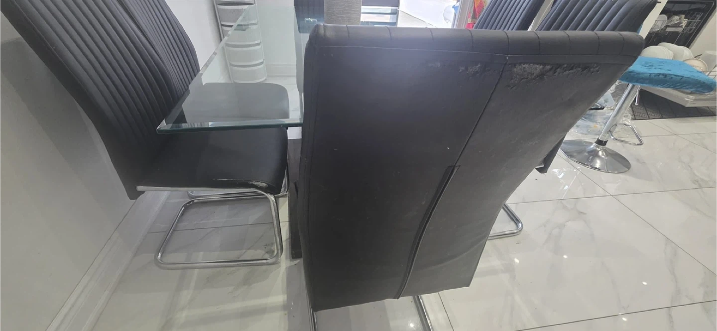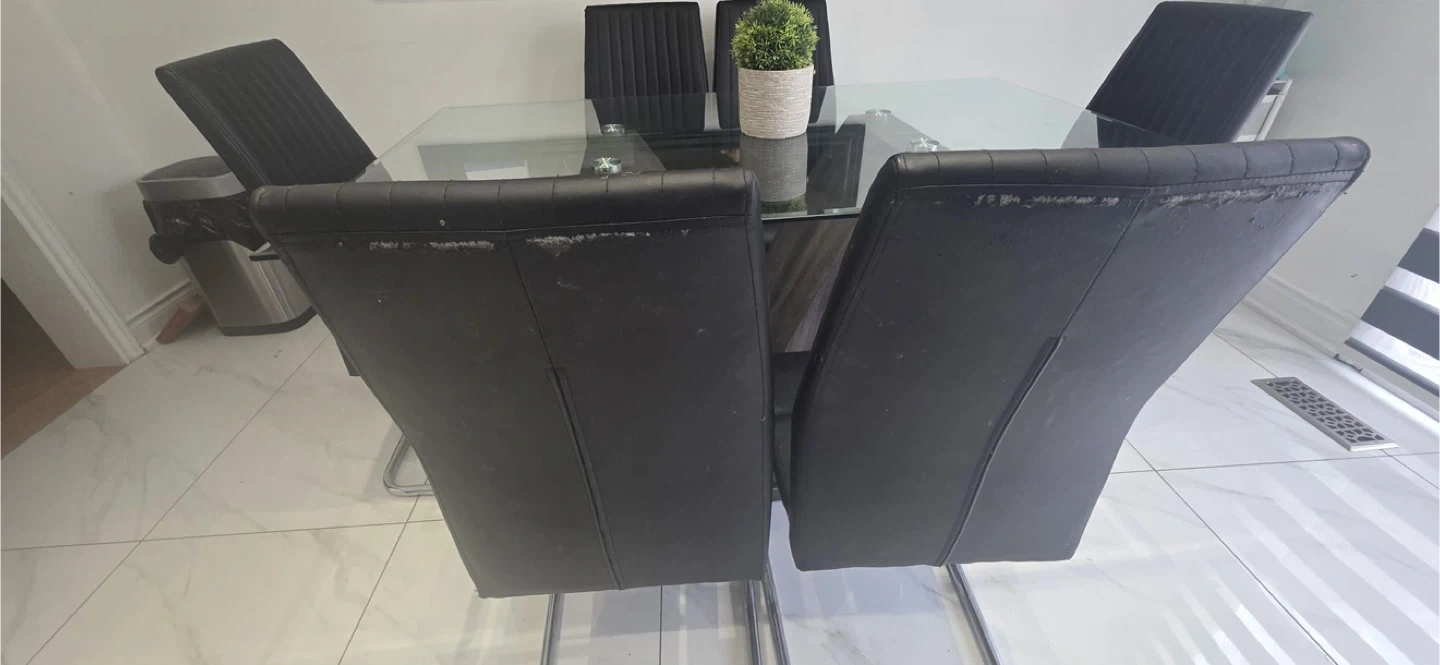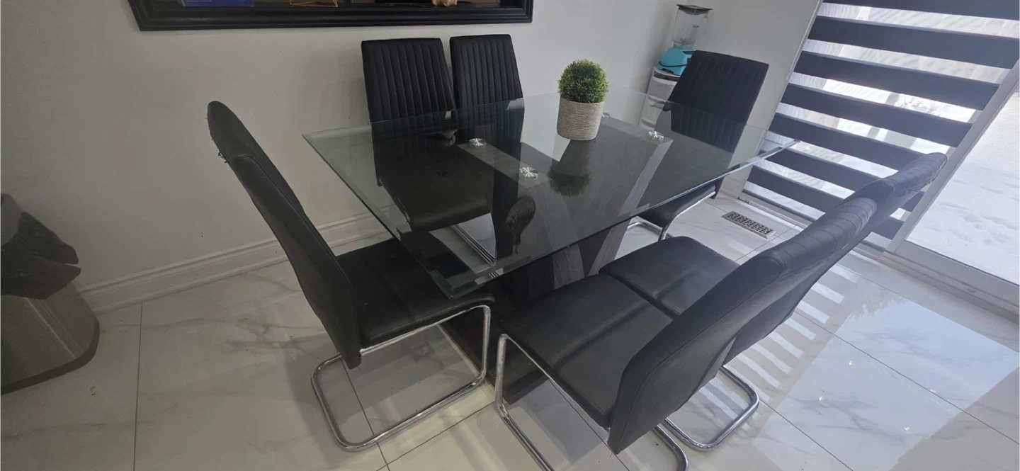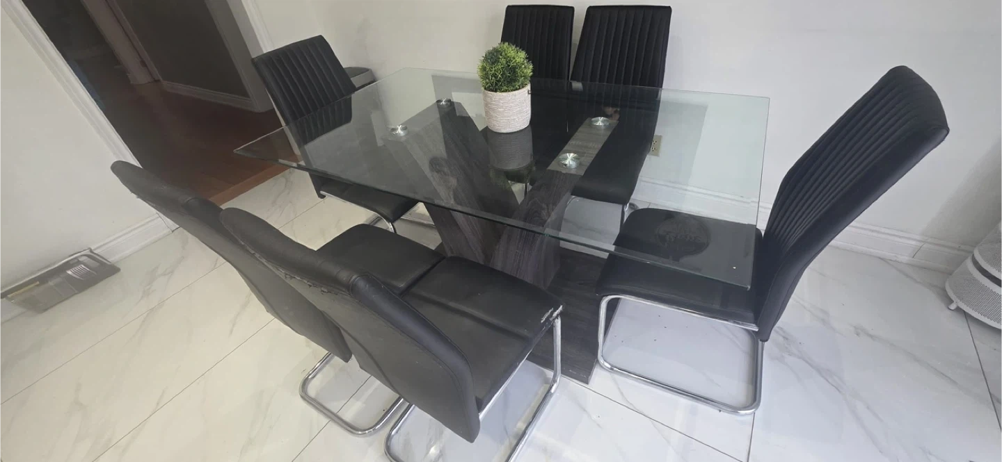 Modern dining set with a clear glass tabletop and a stylish dark wood pedestal base. It comes with six (6) black faux leather dining chairs with chrome legs. Some wear and tear on the chair upholstery is visible.🥕🥕