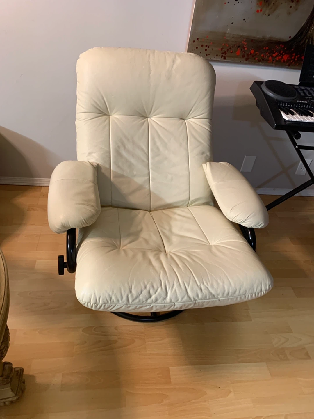 Comfortable cream leather recliner chair with a swivel base. It's tufted for extra comfort and has padded armrests. This chair is perfect for relaxing in your living room.