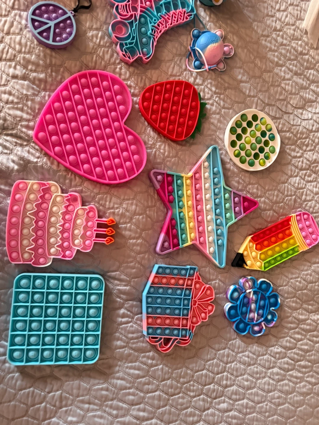 A fun collection of pop it fidget toys in various shapes and colours. These silicone toys provide satisfying pops and are great for stress relief. Includes stars, hearts, fruits, and more!